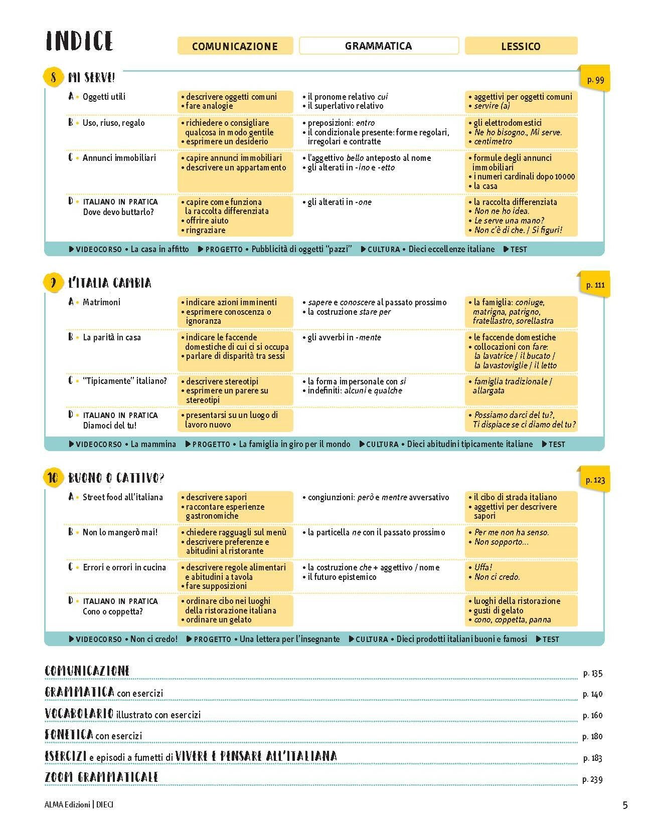 Include anche un VIDEOCORSO in 10 episodi, una GRAMMATICA, un VOCABOLARIO ILLUSTRATO, un ESERCIZIARIO e gli episodi a fumetti di "VIVERE E PENSARE ALL'ITALIANA".