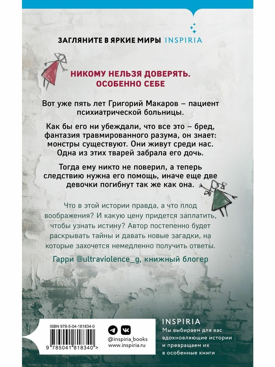 Вот уже пять лет Григорий Макаров — пациент психиатрической больницы. Как бы его ни убеждали, что все это — бред, фантазия травмированного разума, он знает: монстры существуют. Они живут среди нас. Одна из этих тварей забрала его дочь. Тогда ему никто не поверил, а теперь следствию нужна его помощь, иначе еще две девочки погибнут так же, как она.