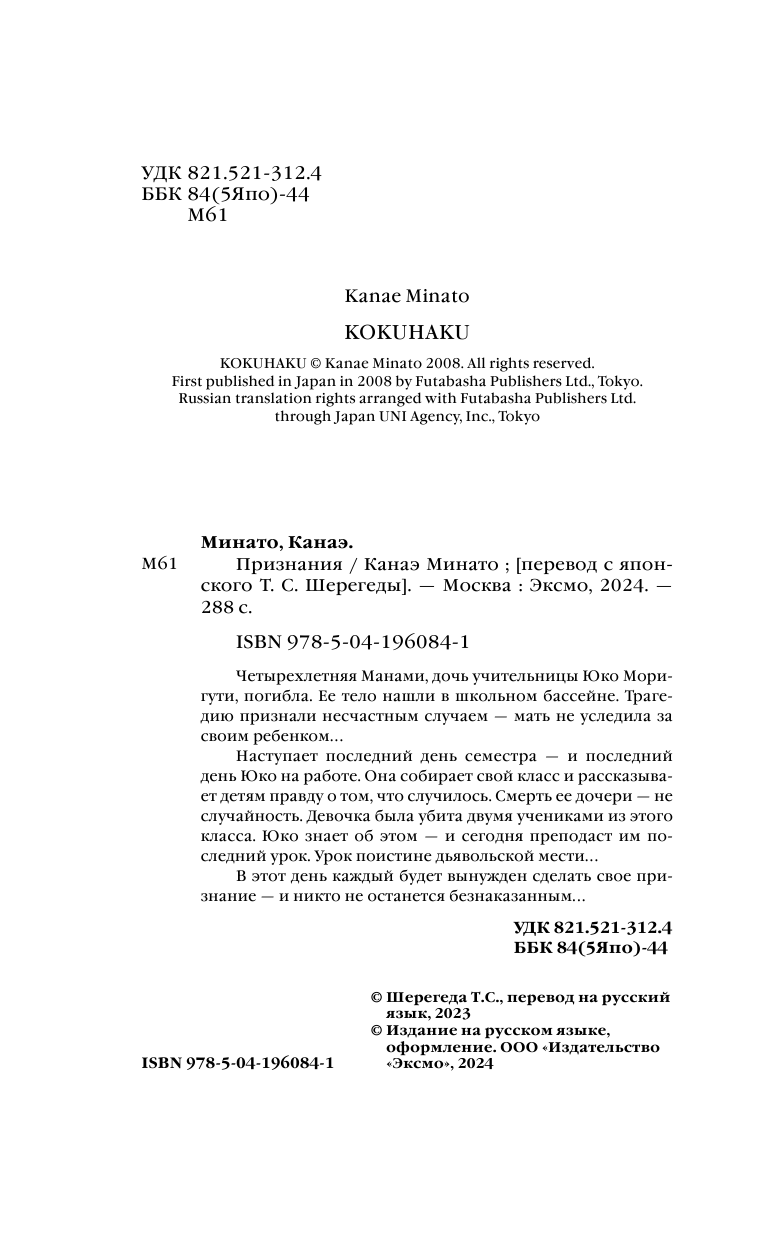 Книга: Признания (Канаэ Минато); Эксмо, Inspiria, Редакция 1, 2024