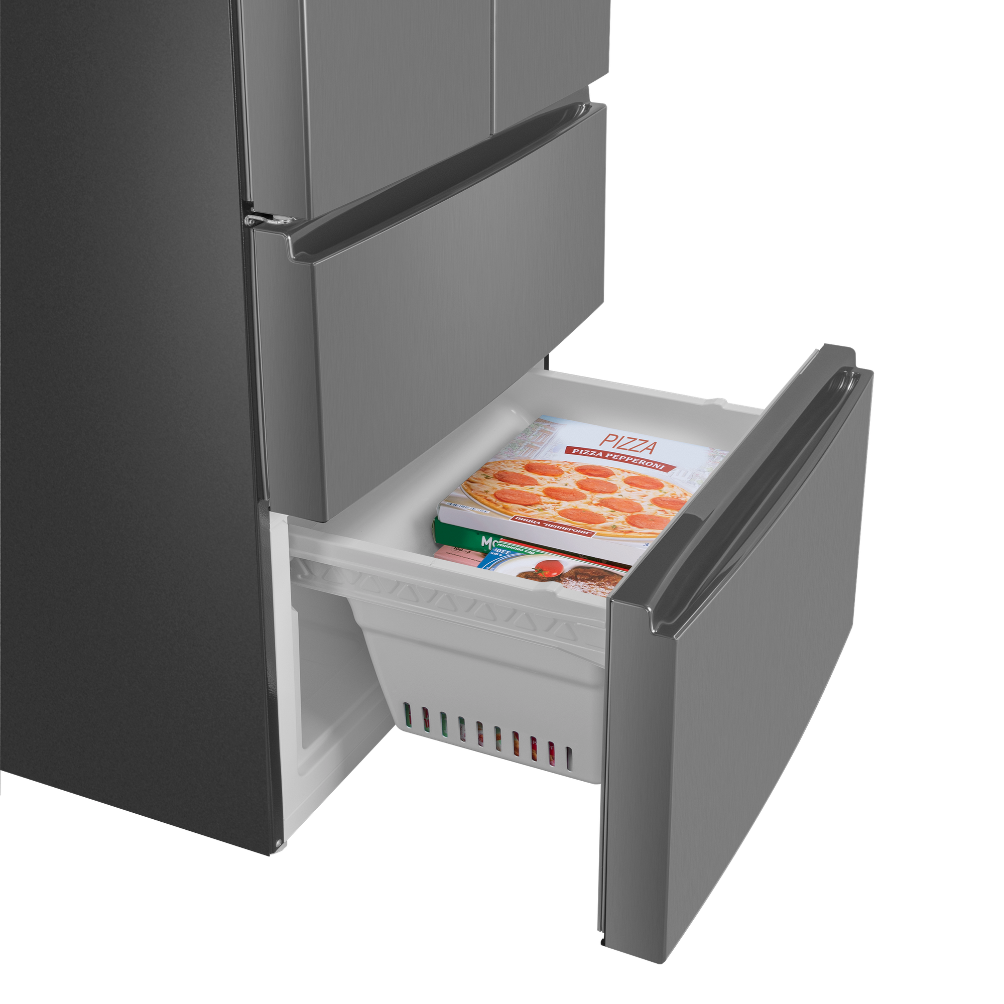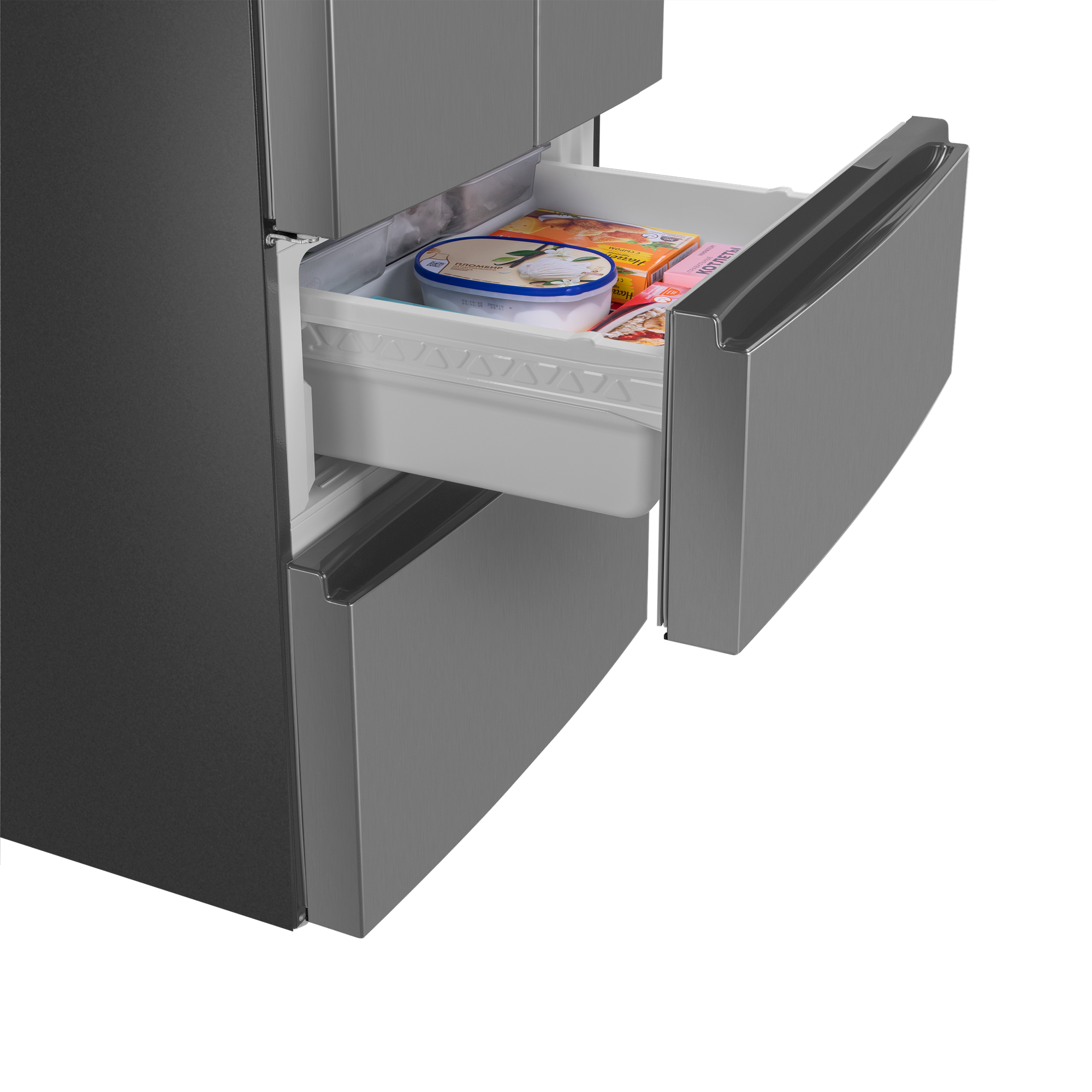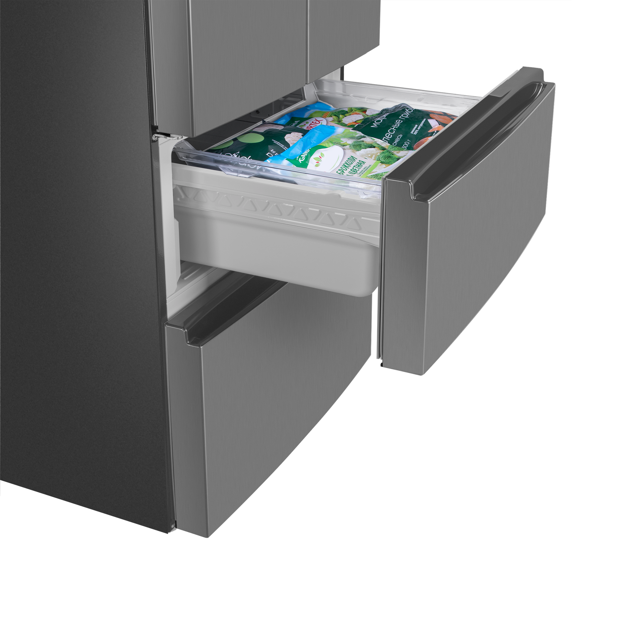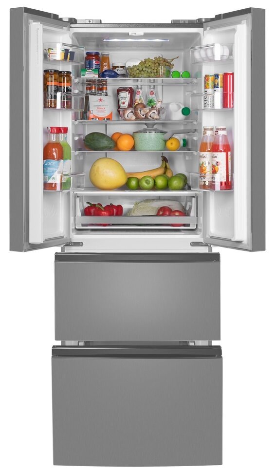 Зона свежести создаёт все условия, чтобы содержимое холодильника как можно дольше оставалось свежим. В зоне для хранения мяса и рыбы с регулируемой температурой от 0 °C до -3 °C продукты остаются свежими в 3 раза дольше, а фрукты, овощи и зелень – даже в 5 раз дольше благодаря контролю уровня влажности.Ящик в холодильном отделении имеет регулировку режимов работы: режим Chill для хранения мяса, птицы или рыбы обеспечивает температуру около 0 градусов, а режим Vege для хранения фруктов и овощей - до 3 градусов.Холодильники с «французской дверцей» отличаются большой вместительностью и оригинальным дизайном. Выдвижные ящики морозильника превосходно удерживают холод и позволяют лучше разглядеть содержимое, чем распашные дверцы. Светодиодная подсветка даёт равномерный, яркий свет и обеспечивает отличный обзор пространства холодильника. Светодиоды потребляют меньше энергии, чем лампы накаливания, и служат намного дольше.С интеллектуальной технологией Total No Frost вы навсегда забудете о необходимости вручную размораживать холодильник и морозильную камеру. Благодаря равномерному распределению холодного воздуха в камере и на продуктах не образуется лёд.Полки из закалённого ударопрочного стекла позволяют хранить крупные и габаритные продукты и тяжёлую посуду. Полки оснащены стильными металлическими фреймами. И это не только декоративный элемент, придающий холодильнику современный вид: фреймы защищают от трещин и сколов, а также препятствуют стеканию жидкостей в случае их пролития.Регулируемые по высоте полки позволяют легко группировать продукты по типу. Организация продуктов внутри холодильника стала ещё удобнее.Внутреннее антибактериальное покрытие предотвращает образование плесени и размножение микробов. Это гарантия свежести во всех отношениях.Современный хладагент R600A «Зелёные» технологии абсолютно безвреден для окружающей среды. Такой хладагент не причиняет вреда озоновому слою.
