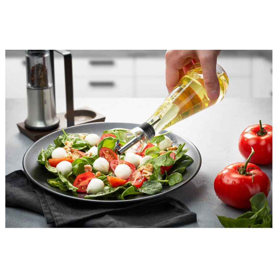 - Изящная бутылка для уксуса или масла из хрусталя со струером из нержавеющей стали, предотвращающим протекание, с клапаном для удобного дозирования.