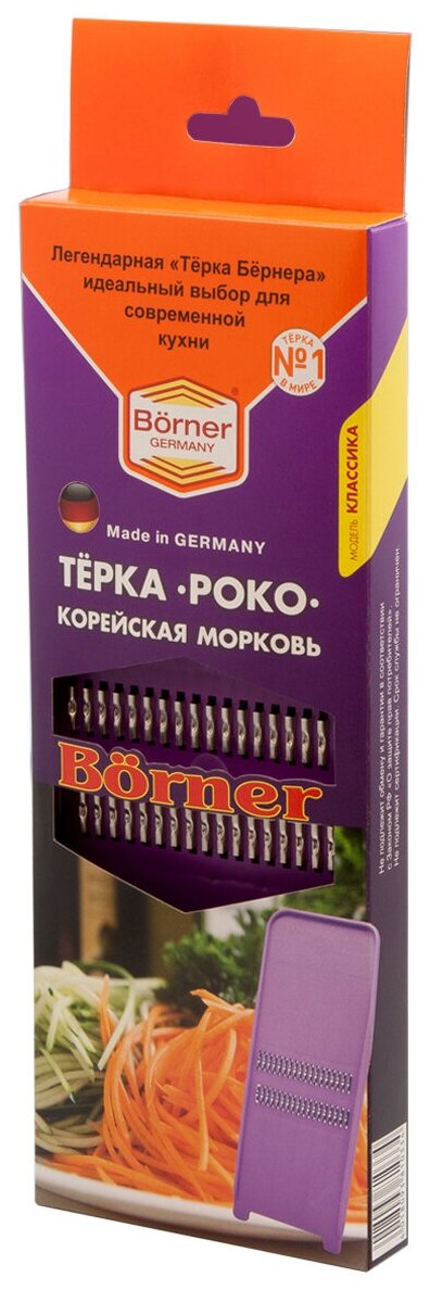 «Borner Роко » – простая в использовании и безопасная тёрка, предназначенная для приготовления корейских салатов. Она изготовлена из пластика и прочной нержавеющей стали – гигиеничных материалов, за которыми легко ухаживать.универсальностьАксессуар подходит для обработки различных овощей: моркови, дайкона, редиски, кабачков и всего прочего, что вы решите использовать в кулинарных целях. Также на нём можно измельчать шоколад и твёрдый сыр.ТАК, КАК ВАМ нужноЭта модель позволяет нарезать овощи длинной или короткой соломкой, а также превратить их в мелкую стружку либо крошку.