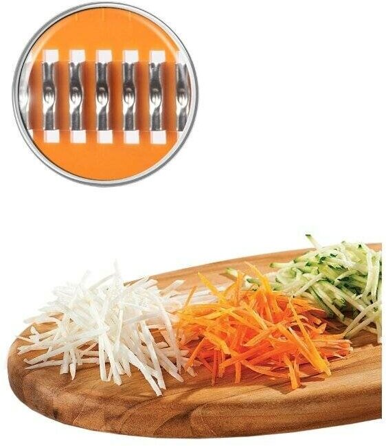 Купила терку больше месяца назад. Очень понравилась. Лезвия заточены с двух сторон, можно резать в две стороны ( очень ускоряет процесс) Очень удобная для корейской морковки. В упаковке нашла рецепты для приготовления блюд на этой терке. Также тру на ней салаты с редиской и огурцом. Настоятельно рекомендую пользоваться плододержателем, так как она очень-очень острая.