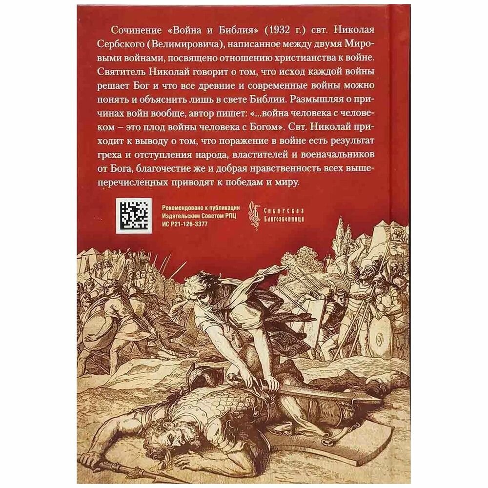 Сочинение "Война и Библия" (1932 г.) свт. Николая Сербского (Велимировича), написанное между двумя Мировыми войнами, посвящено отношению христианства к войне. Святитель Николай говорит о том, что исход каждой войны решает Бог и что все древние и современные войны можно понять и объяснить лишь в свете Библии. Размышляя о причинах войн вообще, автор пишет: "...война человека с человеком - это плод войны человека с Богом". Свт. Николай приходит к выводу о том, что поражение в войне есть результат греха и отступления народа, властителей и военачальников от Бога, благочестие же и добрая нравственность всех вышеперечисленных приводят к победам и миру. Данное сочинение свт. Николая (Велимировича) будет полезным для самого широкого круга православных читателей.