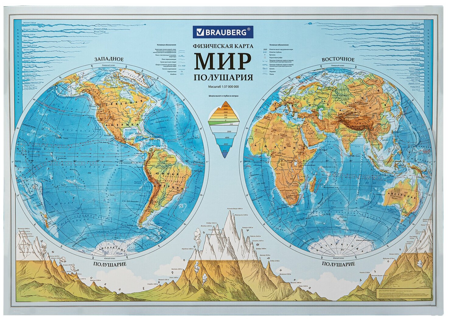 Карта мира физическая Полушария 101х69 см 1:37М интерактивная в тубусе BRAUBERG 112376, 2021