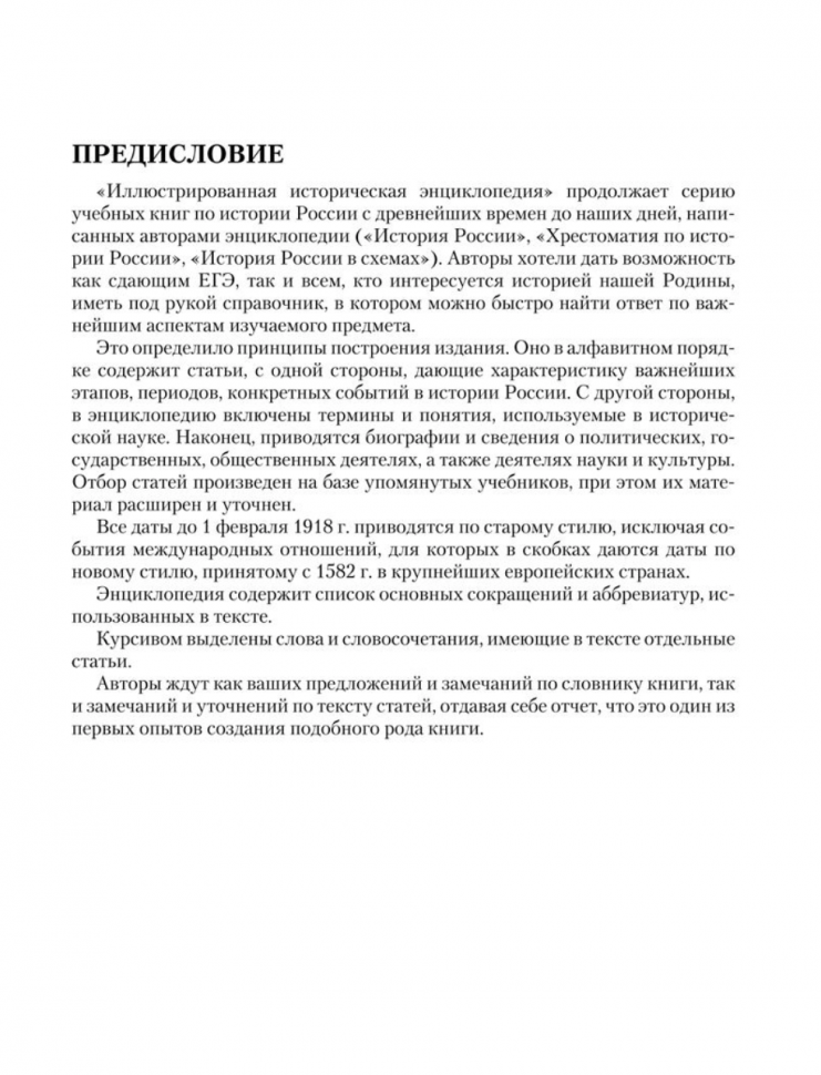 Издание продолжает серию учебных книг по истории России с древнейших времен до наших дней ("История России", "Хрестоматия по истории России", "История России в схемах", "История России в датах"), написанных авторами энциклопедии. Справочник включает более 2000 статей об исторических понятиях и терминах, важнейших событиях, фактах и принятых документах, именах отечественных и зарубежных деятелей, оказавших влияние на осуществление внутренней и внешней политики России, развитие ее культуры. Для выпускников средней школы, сдающих ЕГЭ по истории России, абитуриентов, студентов вузов и всех интересующихся историей Отечества.