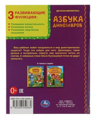 Яркие красивые иллюстрации и интересные стихи о динозаврах - это то, что нужно для первого обучения чтению. С такой книгой изучать буквы и цифры будет не только полезно, но и увлекательно, а занимательные тексты стихов и красочное оформление не дадут малышу заскучать. Благодаря удобному формату книжку можно взять с собой в дорогу. Книга «Азбука динозавров» из серии «Детская библиотека» - замечательный подарок для детишек, которые только учатся читать и считать: - учим азбуку и счёт в стихах, - интересные стихотворения Ольги Кузнецовой, - знакомимся с разными представителя доисторических ящеров, - крупные буквы и цифры, - красочные иллюстрации, - твёрдый переплёт. Материал: офсетная… бумага. Рекомендовано детям старшего дошкольного возраста.