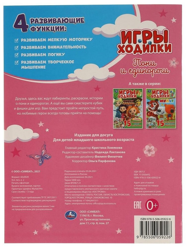 Активити с играми-ходилками «Пони и Единороги» ТМ «УМка» станет прекрасным подарком для маленького любознайки:- 15 элементов- игры-ходилки- фишки и кубик: вырезай и клей- весёлые историиВ этой книге ребёнок найдёт интересные истории, занимательные задания, увлекательные игры и фишки с изображением очаровательных персонажей. Для игры необходимо вырезать кубик, сделать фишки, поставить их на игровое поле – и вперёд за приключениями! Активити имеет удобный формат, поэтому её можно взять с собой в дорогу.Игровые занятия с активити ТМ «УМка» развивают:- мелкую моторику- внимательность- логику- творческое мышлениеОбъём: 12 стр. Формат: 210 х 285 мм.Материал: бумага офсетная.Рекомендовано детям младшего школьного возраста.