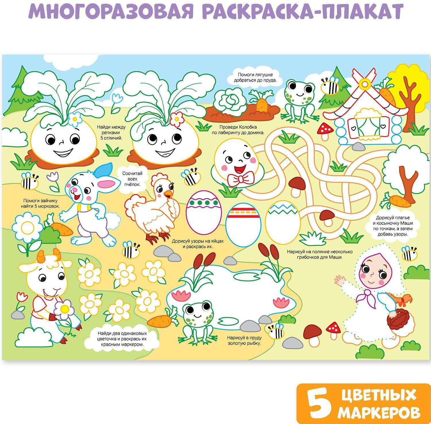 Многоразовая раскраска-плакат имеет глянцевое покрытие. С него без труда можно стереть маркер. Поэтому раскрашивать можно не один раз. Плакат двусторонний, а значит, пространства для творчества будет в 2 раза больше! Во время занятий малыш потренирует моторику, а также раскроет свою фантазию. В комплект входят 5 разноцветных маркеров на водной основе. У каждого маркера есть колпачок со стирателем.