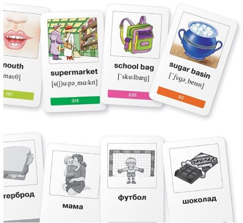 На карточках размещены наиболее употребимые английские слова, относящиеся к базовой лексике. Все слова сопровождаются занимательными иллюстрациями, а также транскрипцией и переводом на русский язык. Предусмотрена возможность самостоятельного создания дополнительных карточек с использованием имеющихся в комплекте заготовок. Карточки предназначены для детей дошкольного и младшего школьного возраста. Темы карточек: семья, дом, еда, посуда, природа, растения, животные, человек, одежда, обувь, школа, увлечения, профессии, город. Размер карточки: 4,2х6,8 см.