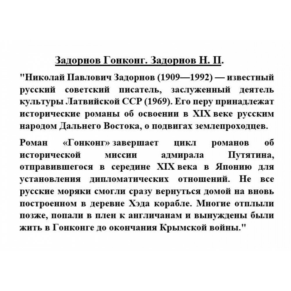 Задорнов Гонконг. Задорнов Н. П. "Николай Павлович Задорнов (1909 — 1992) — известный русский советский писатель, заслуженный деятель культуры Латвийской ССР (1969). Его перу принадлежат исторические романы об освоении в XIX веке русским народом Дальнего Востока, о подвигах землепроходцев. Роман «Гонконг» завершает цикл романов об исторической миссии адмирала Путятина, отправившегося в середине XIX века в Японию для установления дипломатических отношений. Не все русские моряки смогли сразу вернуться домой на вновь построенном в деревне Хэда корабле. Многие отплыли позже, попали в плен к англичанам и вынуждены были жить в Гонконге до окончания Крымской войны. "