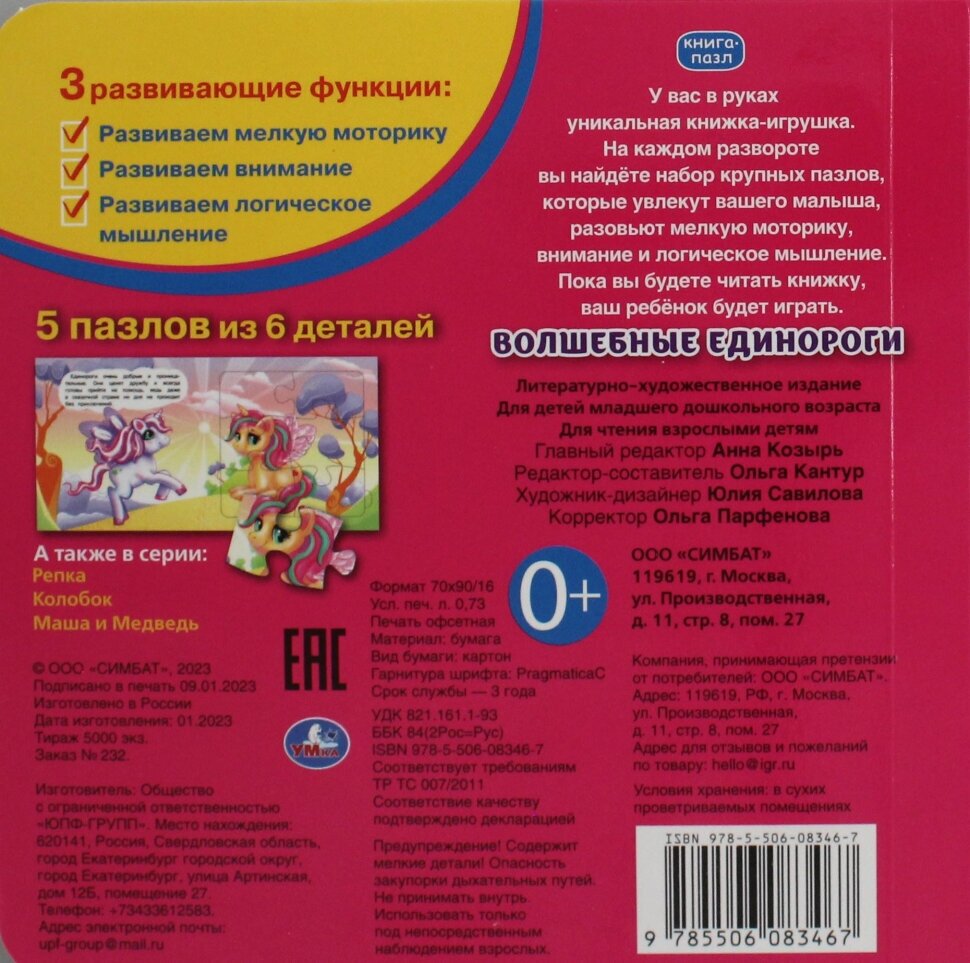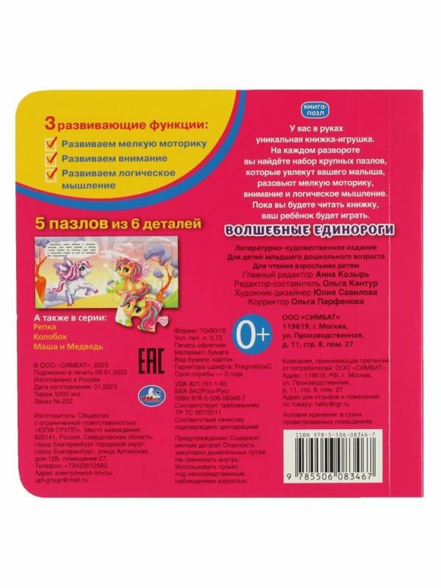 Книга Умка 9785506083467 Волшебные единороги. Книга с 5 пазлами на стр. Размер упаковки: 16*16*1 см. Размер изделия: 16*16*1 см. Страниц: 10 Функционал: книжка с пазлами, 6 сборных картинок Упаковка: нет Страна обладатель бренда: Россия Материал: картон, пластик Комплектация: книга - 1 шт. Возраст ребенка: от 0 лет Ярко проиллюстрированная книжка-картонка с милыми иллюстрациями содержит занимательные истории и пазлы, которые необходимо собрать, чтобы получилась цельная картинка. Короткие истории будут интересны и понятны малышу. Текст сделан крупным, чтобы дети постарше могли научиться читать его. Книга сделана из плотного картона и качественно иллюстрирована. Такую книгу будет очень интересно читать и разглядывать, а также развивать мелкую моторику и цветовое восприятие. Книжка небольшого размера, ее очень удобно держать в руках. Издание имеет безопасный и удобный формат. Чтение способствует тренировке памяти, усидчивости, слухового и зрительного восприятия, мелкой моторики рук.