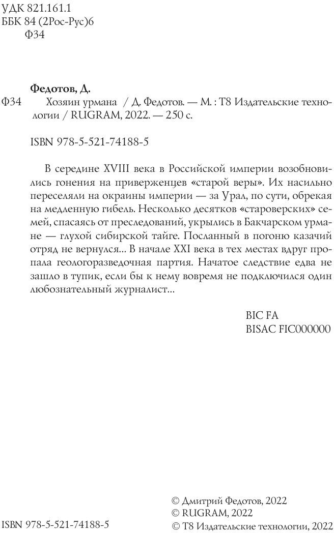 В середине XVIII века в Российской империи возобновились гонения на приверженцев "старой веры". Их насильно переселяли на окраины империи - за Урал, по сути, обрекая на медленную гибель. Несколько десятков "староверских" семей, спасаясь от преследований, укрылись в Бакчарском урмане - глухой сибирской тайге. Посланный в погоню казачий отряд не вернулся. В начале XXI века в тех местах вдруг пропала геологоразведочная партия. Начатое следствие едва не зашло в тупик, если бы к нему вовремя не подключился один любознательный журналист.Издательство RUGRAMМягкий переплетОбъем - 250 стр.Формат - 148x210 мм.ISBN 978-5-521-74188-5Год издания: 2022