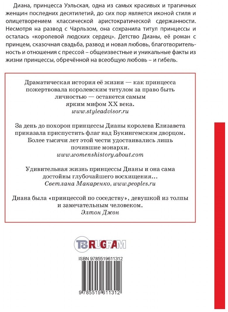 Диана, принцесса Уэльская, одна из самых красивых и трагичных женщин последних десятилетий, до сих пор является иконой стиля и олицетворением классической аристократической сдержанности. Несмотря на развод с Чарльзом, она сохранила титул принцессы и осталась «королевой людских сердец». Детство Дианы, её роман с принцем, сказочная свадьба, развод и новая любовь, благотворительность и отношения с прессой - общеизвестные и уникальные факты из жизни принцессы, обречённой на всеобщую любовь - и гибель.
