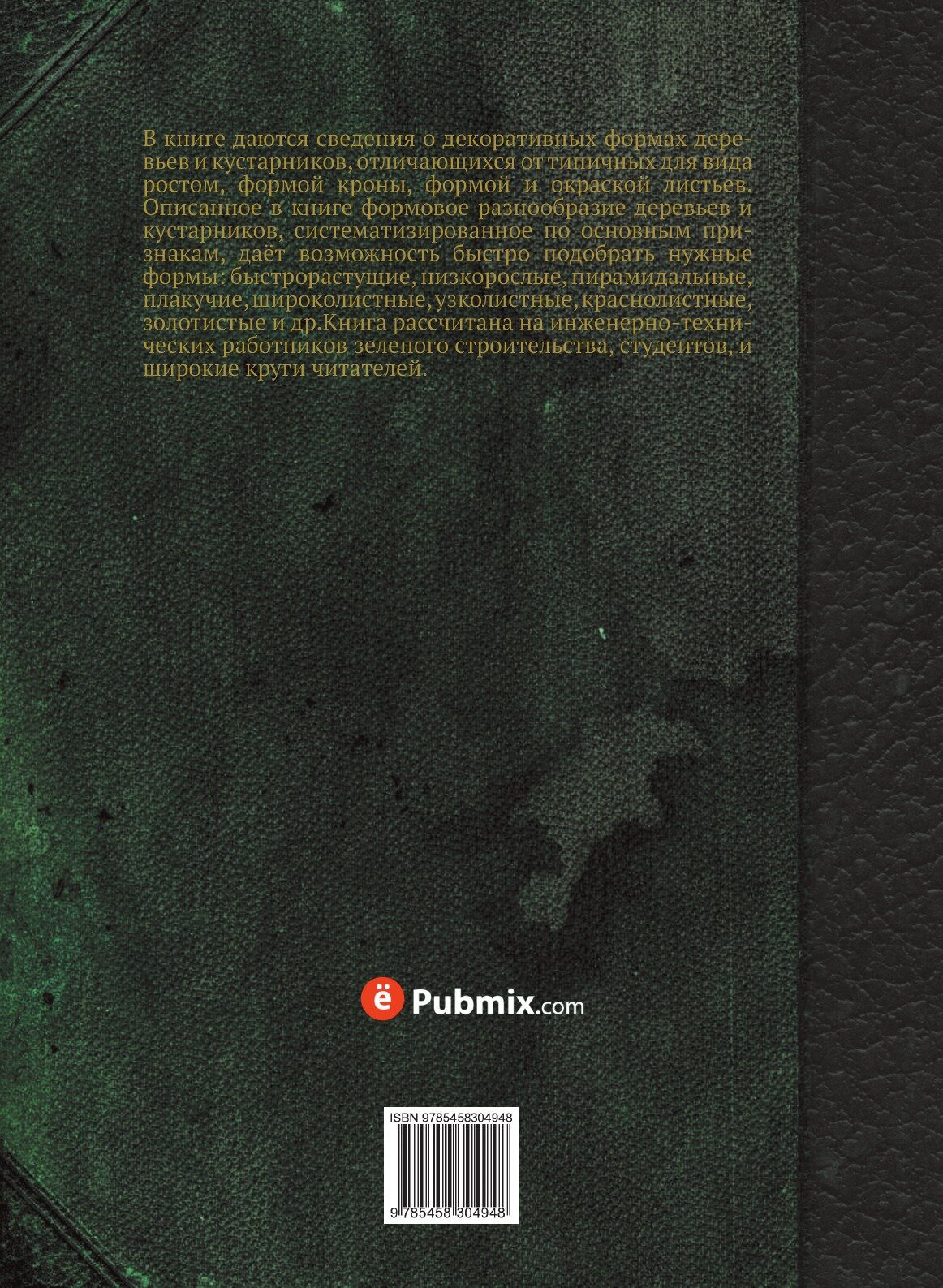 В книге даются сведения о декоративных формах деревьев и кустарников, отличающихся от типичных для вида ростом, формой кроны, формой и окраской листьев.Описанное в книге формовое разнообразие деревьев и кустарников, систематизированное по основным признакам, даёт возможность быстро подобрать нужные формы: быстрорастущие, низкорослые, пирамидальные, плакучие, широколистные, узколистные, краснолистные, золотистые и др.Книга рассчитана на инженерно-технических работников зеленого строительства, студентов, и широкие круги читателей.