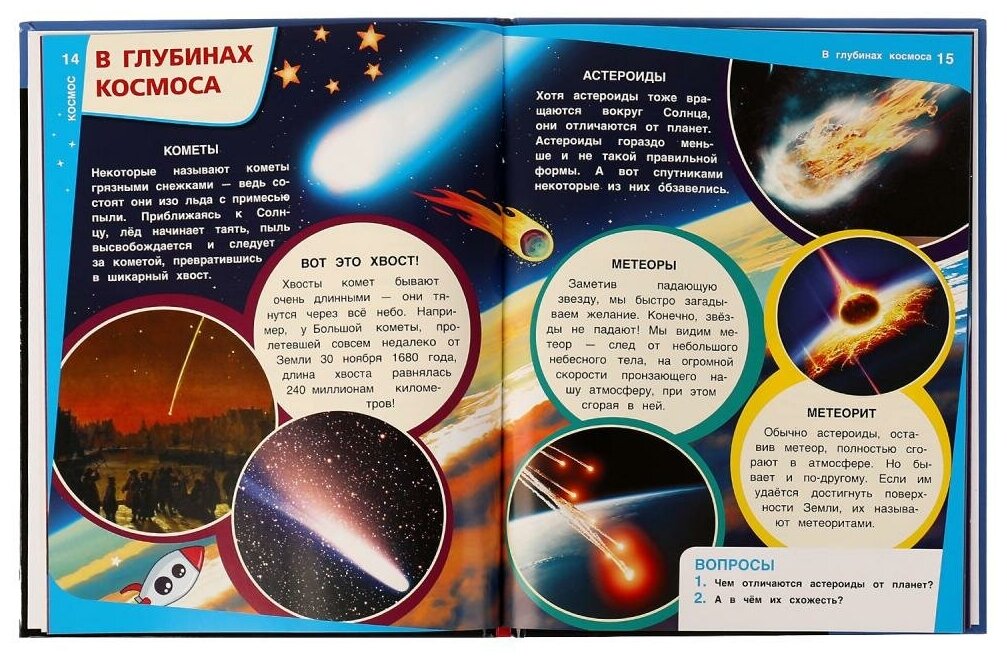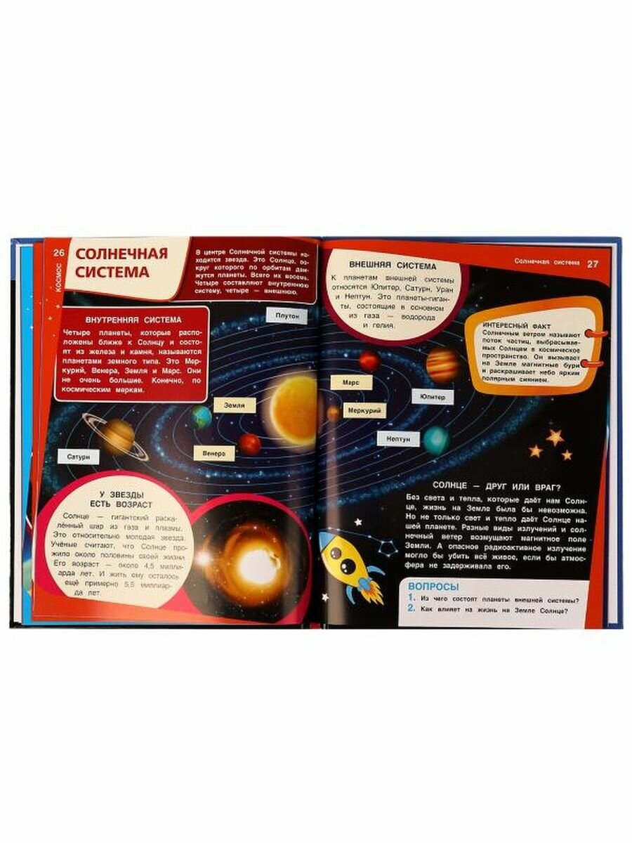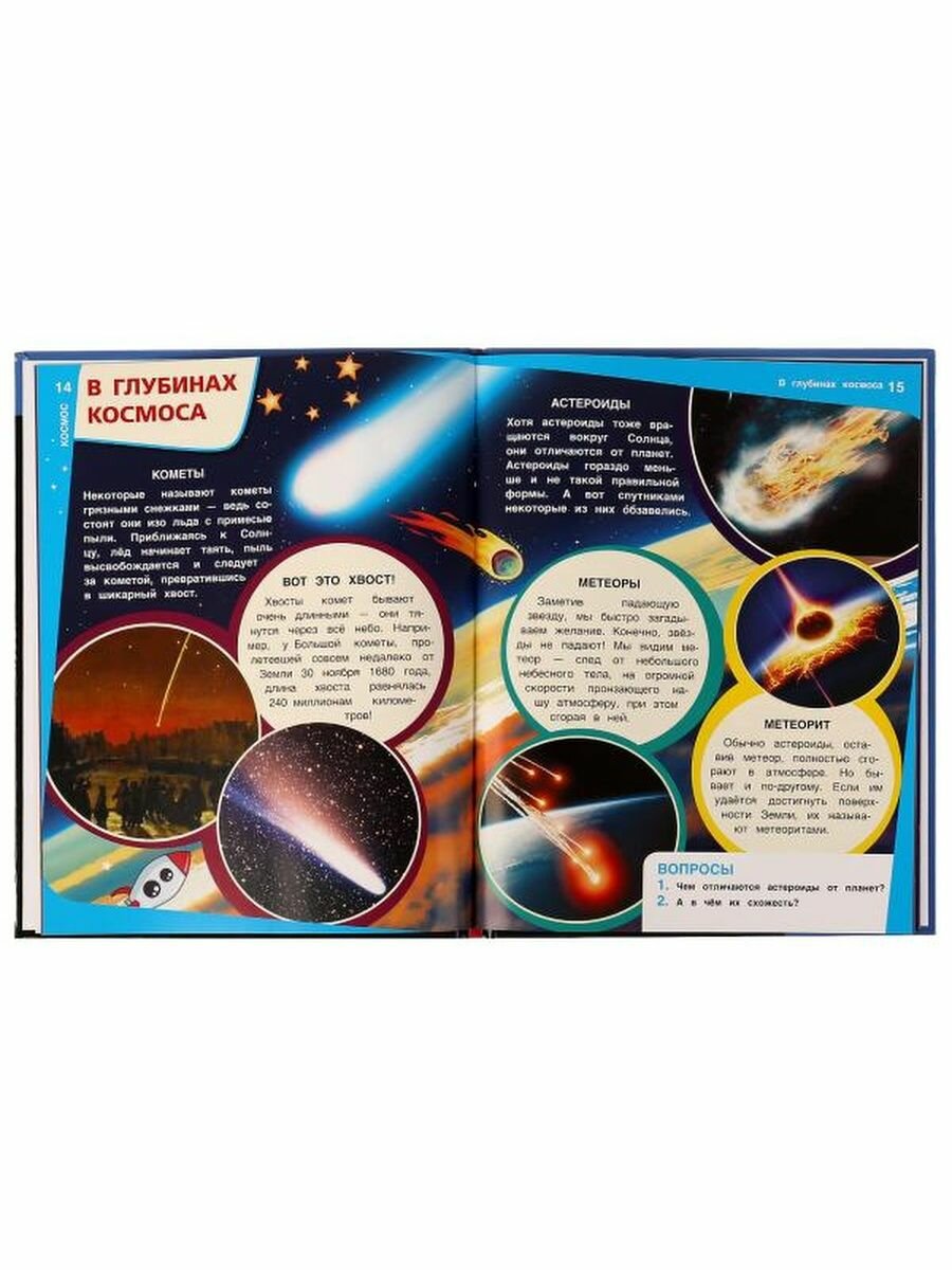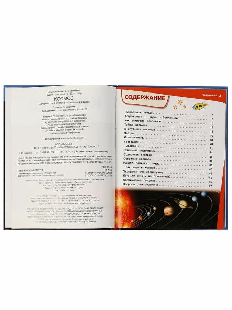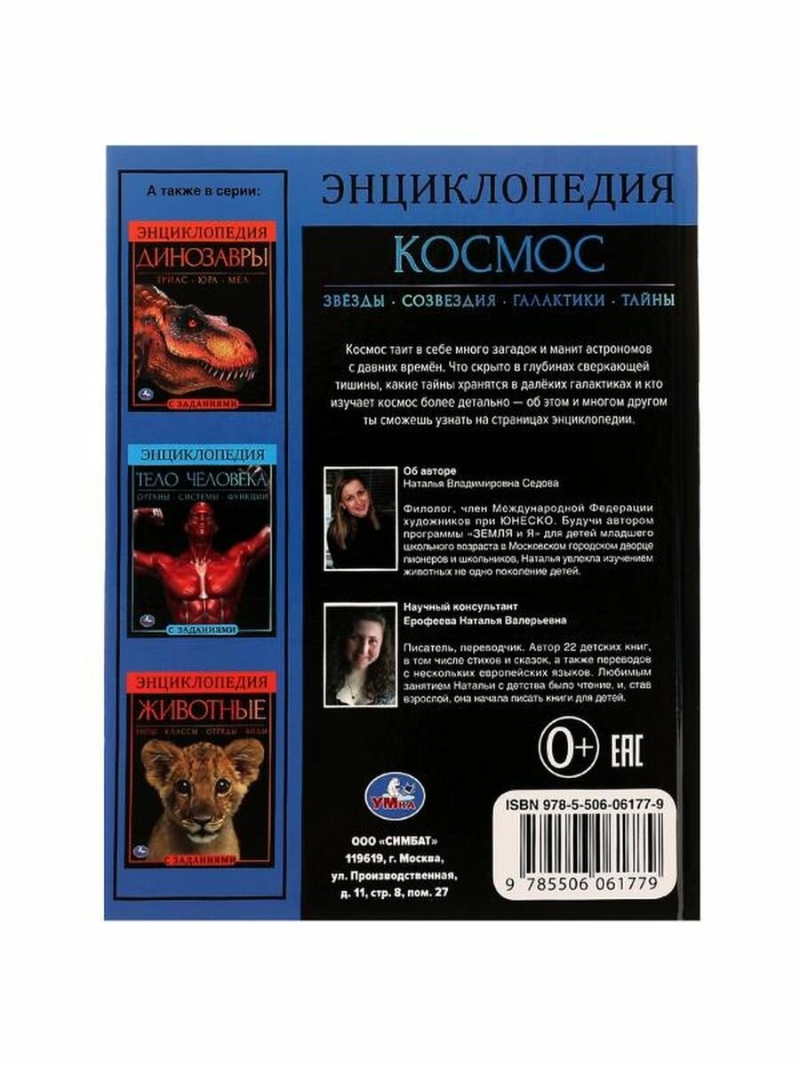 Энциклопедия с заданиями «Космос» ТМ «УМка» - отличный подарок для маленьких любознаек: - красочные иллюстрации - узнаем о звездах, созвездиях, галактиках - вопросы к прочитанному - твердый переплет - гладкие мелованные страницы Эта увлекательная энциклопедия с развивающими заданиями приоткроет перед юным читателем завесу удивительных тайн Вселенной. Яркие картинки, увлекательные рассказы и интересные факты помогут ребенку узнать много нового и расширить кругозор. Чтение энциклопедии ТМ «УМка» способствует развитию: - памяти - внимания - мышления - воображения - усидчивости Объем: 48 стр. Формат: 197 х 255 мм (А4). Материал: офсетная бумага, мелованная. Рекомендовано детям младшего школьного возраста.