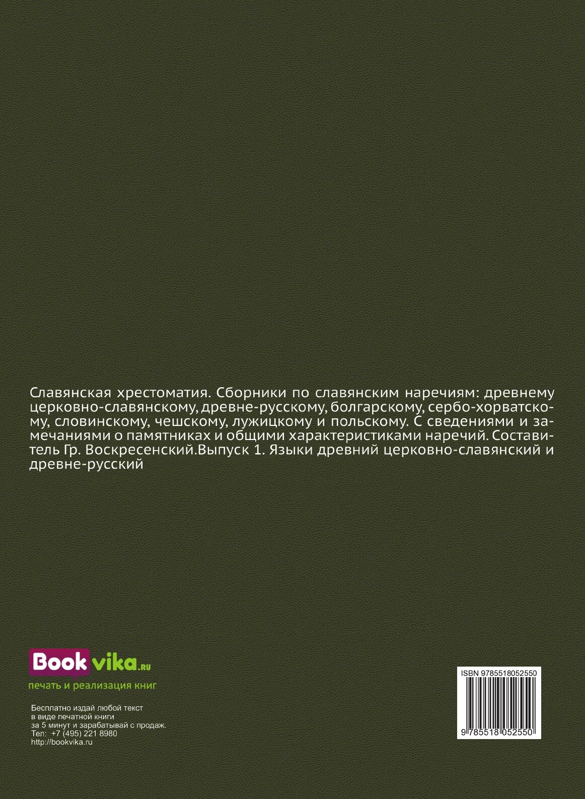 Славянская хрестоматия. Сборники по славянским наречиям: древнему церковно-славянскому, древне-русскому, болгарскому, сербо-хорватскому, словинскому, чешскому, лужицкому и польскому. С сведениями и замечаниями о памятниках и общими характеристиками наречий. Составитель Гр. Воскресенский.Выпуск 1. Языки древний церковно-славянский и древне-русский