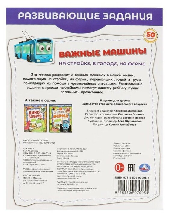 Книга Важные машины. Развивающие задания. 215х275 мм 8 стр. + наклейки Умка в кор.50шт (Галкова С. -редактор-составитель); Умка, 2021