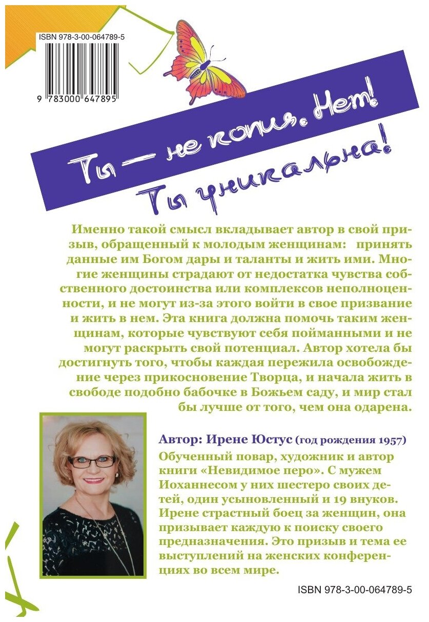 Именно такой смысл вкладывает автор в свой призыв, обращенный к молодым женщинам: принять данные им Богом дары и таланты и жить ими. Многие женщины страдают от недостатка чувства собственного достоинства или комплексов неполноценности, и не могут из-за этого войти в свое призвание и жить в нем. Эта книга должна помочь таким женщинам, которые чувствуют себя пойманными и не могут раскрыть свой потенциал. Автор хотела бы достигнуть того, чтобы каждая пережила освобождение через прикосновение Творца, и начала жить в свободе подобно бабочке в Божьем саду, и мир стал бы лучше от того, чем она одарена.