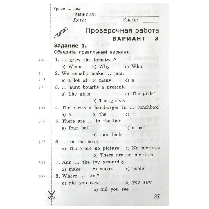 В пособие включены проверочные задания для контроля усвоения грамматического материала 3 класса. Каждая работа имеет четыре варианта. Дома учащиеся готовятся к проверочной работе, просматривая все варианты. На уроке преподаватель сообщает, какой именно вариант следует сделать. Учащиеся выполняют задания, вырезают страницу и сдают её на проверку. Если при подготовке возникнут сложности, то прочитать соответствующее правило и найти ответ можно в КНИГЕ ДЛЯ РОДИТЕЛЕЙ. Номер соответствующего параграфа указан рядом с каждым заданием. Проверочные работы можно использовать и в дидактических целях.