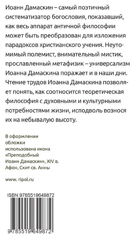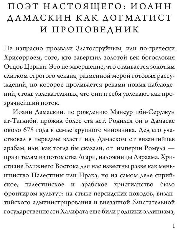 Иоанн Дамаскин - самый поэтичный систематизатор богословия, показавший, как весь аппарат античной философии может быть преобразован для изложения парадоксов христианского учения. Неутомимый полемист, внимательный мистик, прославленный метафизик - универсализм Иоанна Дамаскина поражает и в наши дни.. Чтение трудов Иоанна Дамаскина позволяет понять, как соотносится теоретическая философия с духовными и культурными потребностями жизни, исподволь вознося их на небывалую высоту.