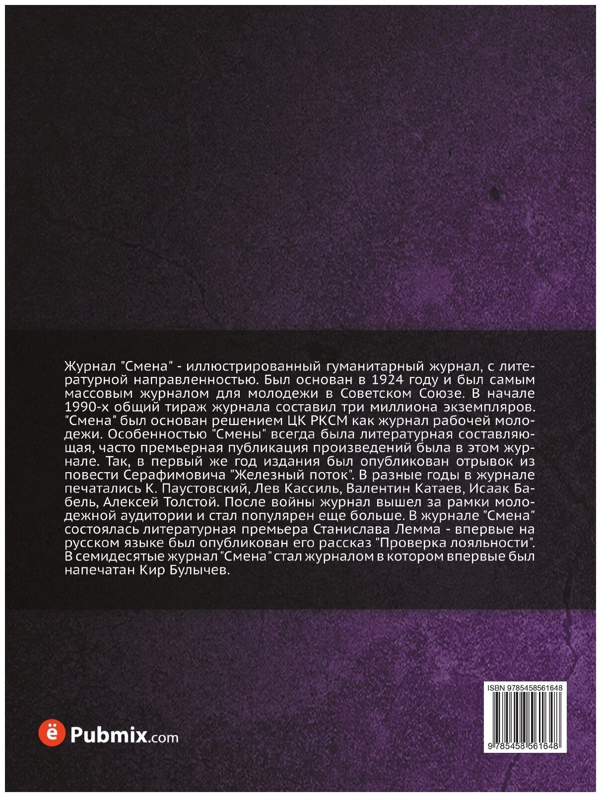 Журнал "Смена" - иллюстрированный гуманитарный журнал, с литературной направленностью. Был основан в 1924 году и был самым массовым журналом для молодежи в Советском Союзе. В начале 1990-х общий тираж журнала составил три миллиона экземпляров. "Смена" был основан решением ЦК РКСМ как журнал рабочей молодежи. Особенностью "Смены" всегда была литературная составляющая, часто премьерная публикация произведений была в этом журнале. Так, в первый же год издания был опубликован отрывок из повести Серафимовича "Железный поток". В разные годы в журнале печатались К. Паустовский, Лев Кассиль, Валентин Катаев, Исаак Бабель, Алексей Толстой. После войны журнал вышел за рамки молодежной аудитории и стал популярен еще больше. В журнале "Смена" состоялась литературная премьера Станислава Лемма - впервые на русском языке был опубликован его рассказ "Проверка лояльности". В семидесятые журнал "Смена" стал журналом в котором впервые был напечатан Кир Булычев.