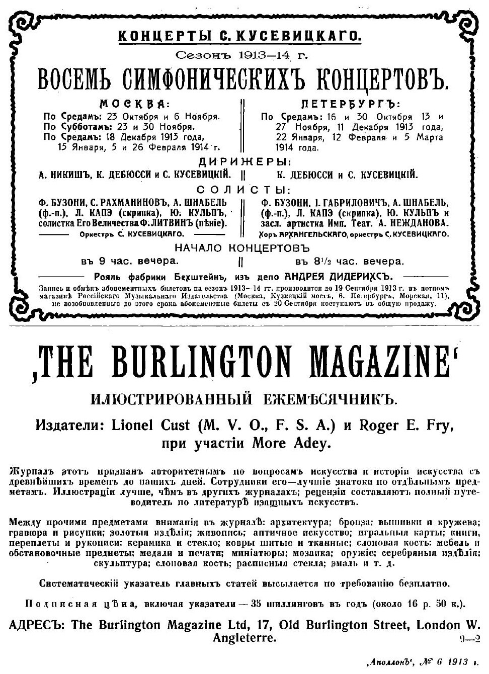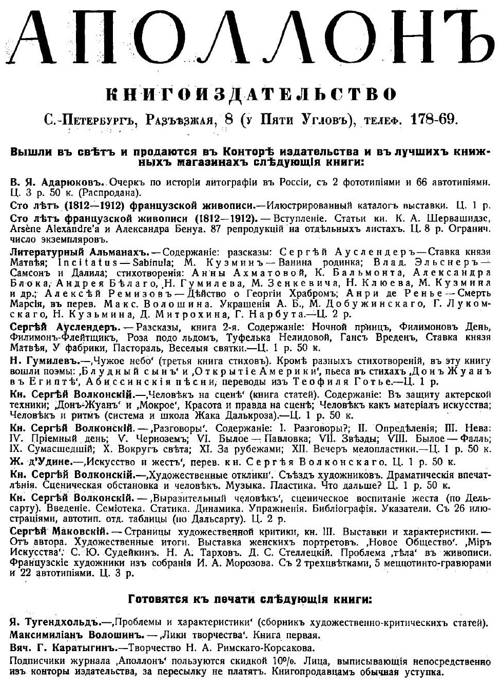 Журнал "Аполлон" издавался с 1909 по 1917 в Санкт-Петербурге. Журнал публиковал материалы по истории классического и современного русского и зарубежного искусства, обзоры выставок, театральной и музыкальной жизни в России и других странах; освещал проблемы изучения и охраны памятников русского искусства. Позиции журнала определялись идеалистическими взглядами и изощрёнными вкусами литературно-художественной элиты, видевшей в революции угрозу культуре, иллюзиями о преображении мира искусством с его духовными ценностями и совершенством формы. "Аполлон" проявлял враждебное отношение и к передвижничеству, и к официально-государственному направлению. В журнале печатались сочинения И. Ф. Анненского, А. А. Блока, В. Я. Брюсова, В. И. Иванова, М. А. Кузмина, Н. С. Гумилёва, художественно-критические статьи В. А. Дмитриева, А. А. Ростиславова, Н. Н. Лунина, Я. А. Тугендхольда. В 1918 в связи с публикацией ряда антисоветских статей "Аполлон" был закрыт.