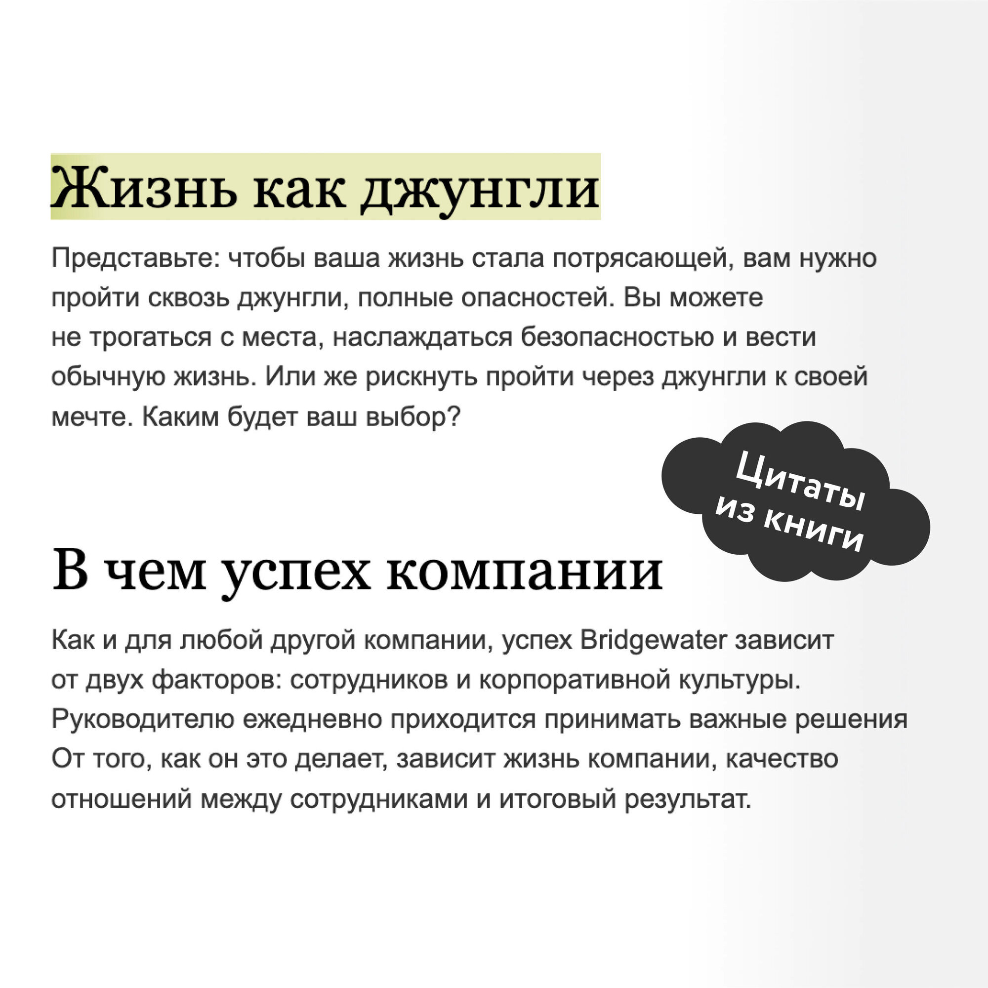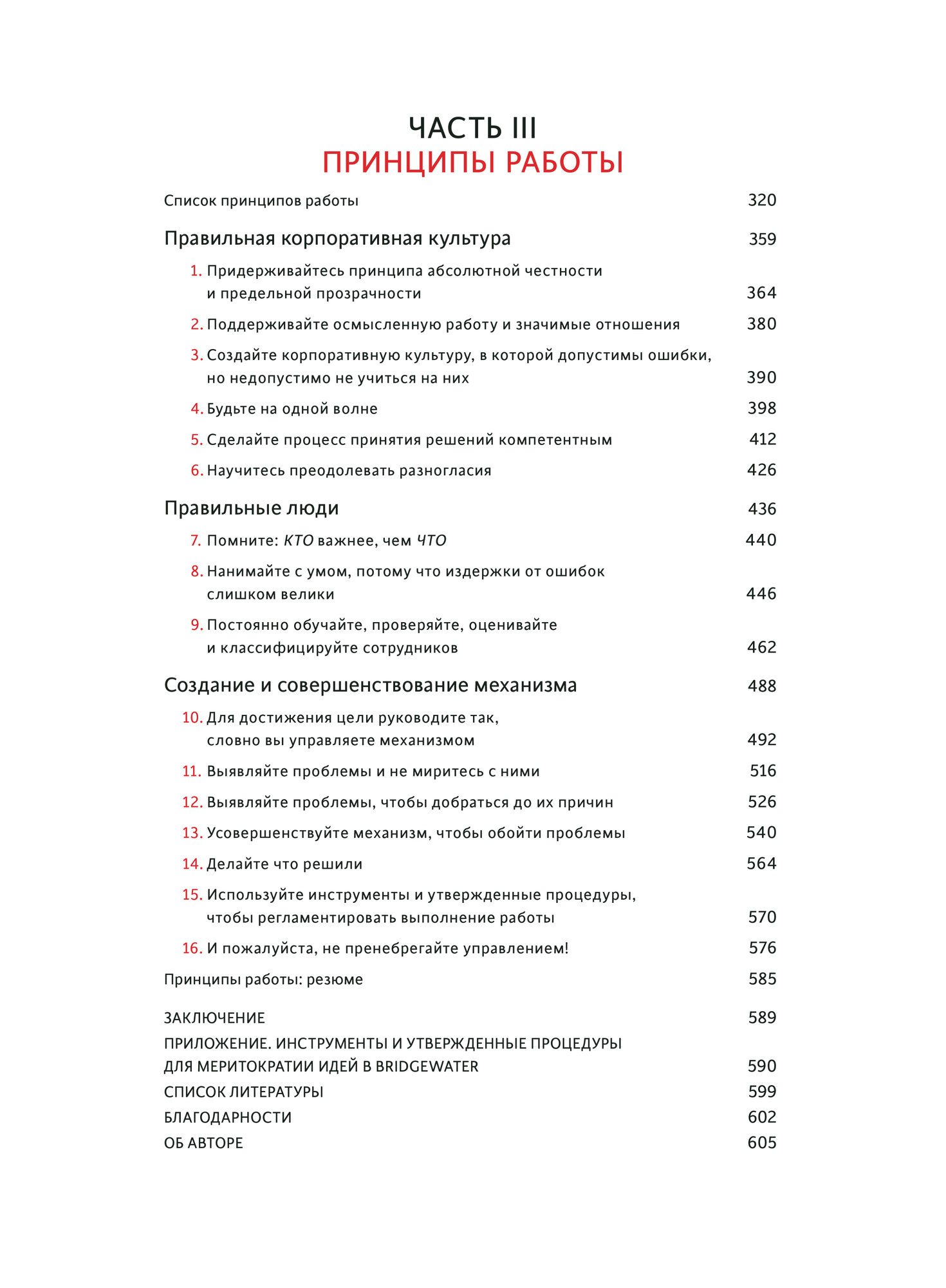 Жизненные и управленческие принципы Рэя Далио, одного из самых влиятельных и богатых людей планеты, и история его детища — крупнейшего в мире хедж-фонда Bridgewater.Рэй Далио вырос в обычной семье со средним достатком. Основанная им в 26 лет инвестиционная фирма Bridgewater Associates в течение следующих 40 лет стала пятой по важности частной компанией в США (по версии Fortune). Секрет ее устойчивости и успеха в том, что Рэй Далио в своей жизни и работе придерживается универсальных принципов, которые выкристаллизовались из ряда побед и поражений. Сила этих личных принципов такова, что они изменили всю отрасль: журнал CIO даже назвал Далио «Стивом Джобсом инвестирования».В этой книге вы найдете все правила жизни и работы американского миллиардера. Вполне возможно, что после ее прочтения ваша жизнь уже не будет прежней.Структура книги:Часть I — краткая биография Рэя Далио и история его хедж-фонда Bridgewater на фоне экономических перипетий, начиная с 1970-х и по сей день.Часть II — принципы жизни Рэя.Часть III — принципы работы, позволившие создать уникальную корпоративную культуру Bridgewater.От автора:Прежде чем я начну делиться с вами своими мыслями, хочу предупредить, что я не всезнайка. Своим успехом в жизни я во многом обязан умению справляться с тем, чего я не знаю. Самым важным моим уроком стал подход к жизни на основе принципов, которые помогают мне понять, что является правдой и как следует поступать.Я рассказываю об этих принципах, потому что нахожусь на том жизненном этапе, когда больше хочу помочь другим стать успешными, чем стать более успешным самому. Эти принципы очень помогли мне и многим другим. Решайте сами, насколько они для вас ценны и как вы будете их применять.Ежедневно каждый из нас сталкивается со множеством ситуаций, на которые должен как-то реагировать. Без принципов мы были бы вынуждены каждый раз обдумывать свой ответ, словно попали в такую ситуацию впервые. Если же систематизировать все эти ситуации по типам и руководствоваться эффективными принципами для каждого типа, мы будем способны быстрее принимать решения и повысить качество жизни.Принципы — это глубинные убеждения, на которых основано поведение человека, позволяющее ему получить то, что он хочет от жизни. Их можно применять снова и снова в похожих ситуациях, чтобы добиться цели.Набор эффективных принципов можно сравнить с хорошим сборником рецептов успеха. Все успешные люди руководствуются принципами, которые помогают им быть успешными. Хотя они сами выбирают, в чем хотят быть успешными, и их принципы отличаются в зависимости от этого.Для кого эта книга:Для финансистов.Для руководителей и собственников бизнеса.Для всех, кому интересны жизненные принципы основателя крупнейшего в мире хедж-фонда.
