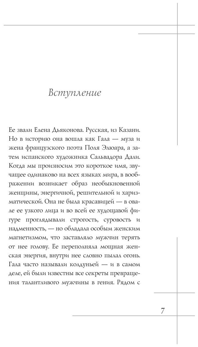 Ее звали Елена Дьяконова. Но в историю она вошла как Гала - муза и жена французского поэта Поля Элюара, а затем испанского художника Сальвадора Дали. Когда мы произносим это короткое имя, звучащее одинаково на всех языках мира, в воображении возникает образ необыкновенной женщины, решительной и харизматической. Она не была красавицей, но обладала особым женским магнетизмом, что заставляло мужчин терять от нее голову. Весь мир до сих пор перечитывает дневники и письма Дали, в которых он восхваляет свою жену. О том, какой была эта женщина и как прожила свою жизнь, в книге писательницы Елены Литвинской. Издание дополнено иллюстрациями и воспоминаниями современников героини.