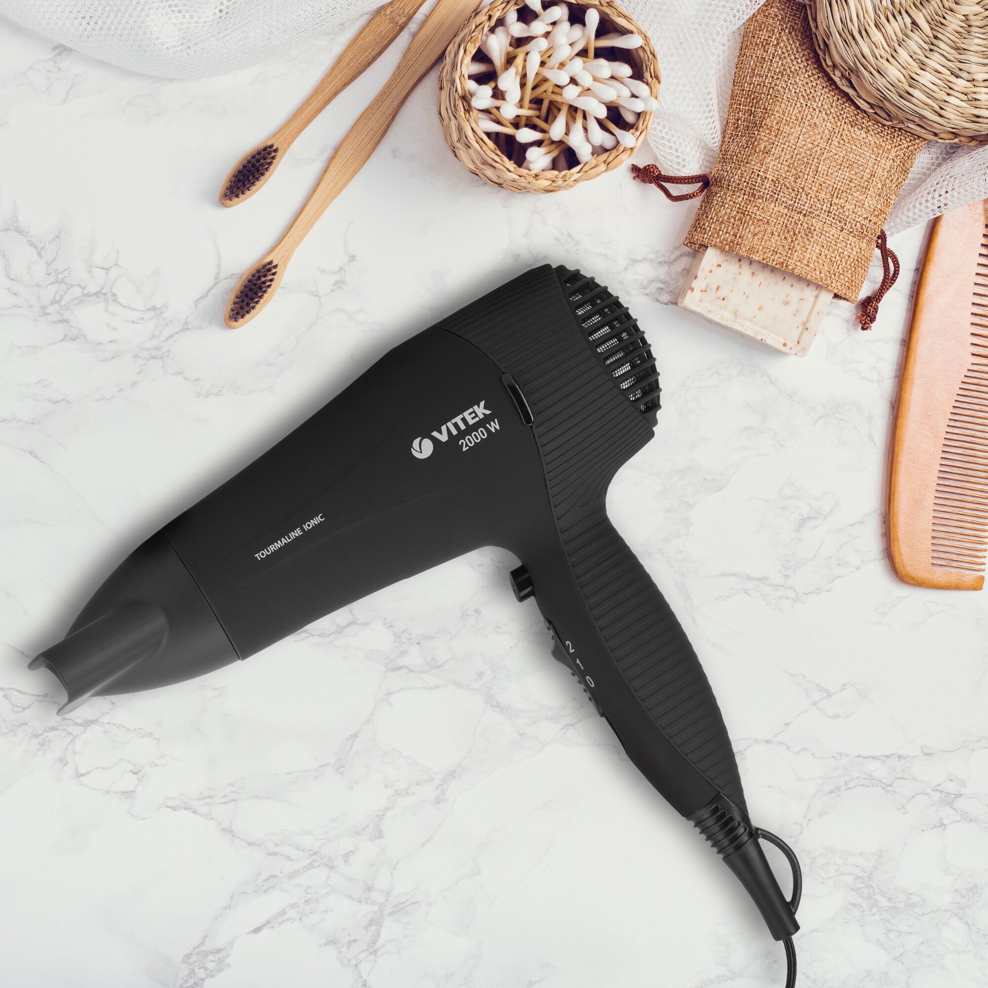 Легко уложить волосы при этом сохранив их естественное здоровье вам позволит мощный, стильный и удобный фен Vitek (BK). Данное устройство гармонично сочетает в себе приятный дизайн и оптимальный набор функций, которые позволят быстро высушить волосы и создать стильную укладку. Важным преимуществом модели является наличие функции Tourmaline Ionic: благодаря данной технологии в фене генерируются ионы, которые предотвращают электризацию волос.