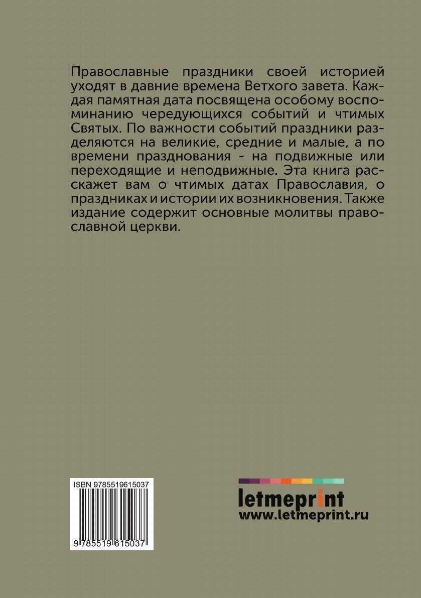 Православные праздники своей историей уходят в давние времена Ветхого завета. Каждая памятная дата посвящена особому воспоминанию чередующихся событий и чтимых Святых. По важности событий праздники разделяются на великие, средние и малые, а по времени празднования - на подвижные или переходящие и неподвижные. Эта книга расскажет вам о чтимых датах Православия, о праздниках и истории их возникновения. Также издание содержит основные молитвы православной церкви.