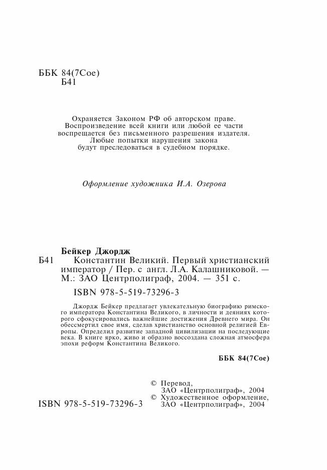 Джордж Бейкер предлагает увлекательную биографию римского императора Константина Великого, в личности и деяниях которого сфокусировались важнейшие достижения Древнего мира. Он обессмертил свое имя, сделав христианство основной религией Европы. Определил развитие западной цивилизации на последующие века. В книге ярко, живо и образно воссоздана сложная атмосфера эпохи реформ Константина Великого.