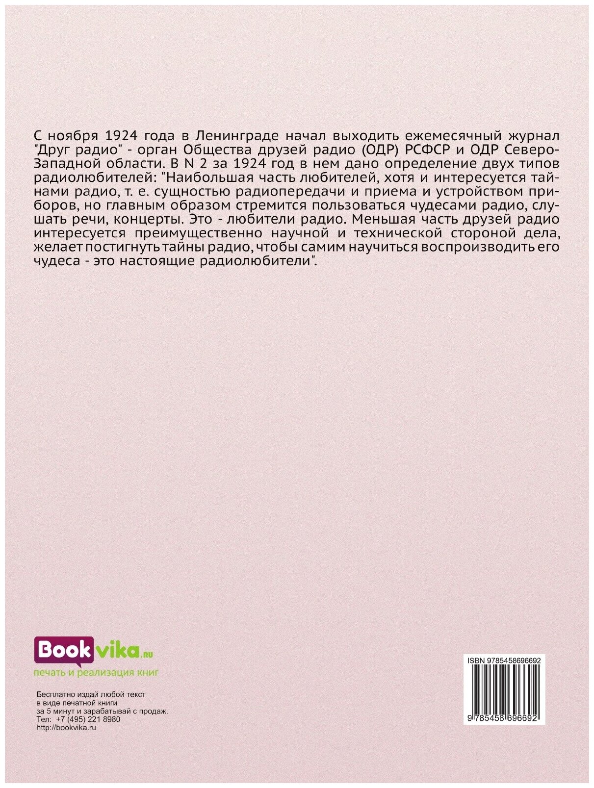 С ноября 1924 года в Ленинграде начал выходить ежемесячный журнал "Друг радио" - орган Общества друзей радио (ОДР) РСФСР и ОДР Северо-Западной области. В N 2 за 1924 год в нем дано определение двух типов радиолюбителей: "Наибольшая часть любителей, хотя и интересуется тайнами радио, т. е. сущностью радиопередачи и приема и устройством приборов, но главным образом стремится пользоваться чудесами радио, слушать речи, концерты. Это - любители радио. Меньшая часть друзей радио интересуется преимущественно научной и технической стороной дела, желает постигнуть тайны радио, чтобы самим научиться воспроизводить его чудеса - это настоящие радиолюбители".