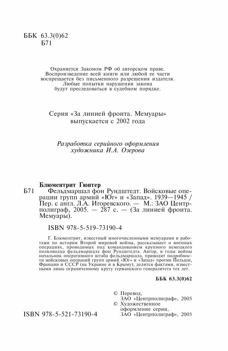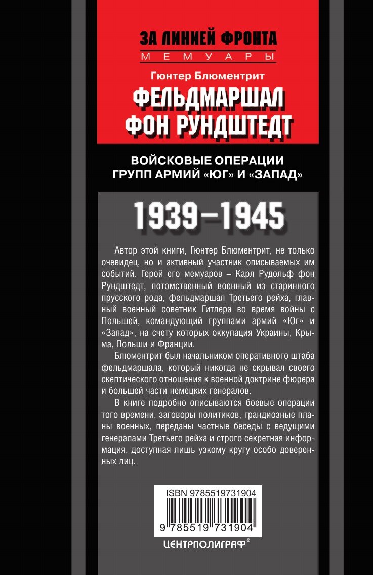 Г. Блюментрит, известный многочисленными мемуарами и работами по истории Второй мировой войны, рассказывает о военных операциях, проводимых под командованием крупного немецкого полководца фельдмаршала фон Рундштедта. Автор, в годы войны -начальник оперативного штаба фельдмаршала, приводит подробности войсковых операций групп армий «Юг» и «Запад»...