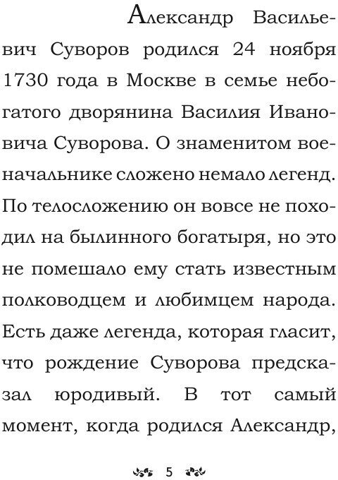 Александр Васильевич Суворов - прославленный русский полководец, выдающийся военный теоретик, стратег и тактик, во многом опередивший своё время. Его именем названы улицы, проспекты, площади, ему возведены памятники по всей России и за её пределами, созданы суворовские училища, открыты музеи полководца, одна из высших российских наград носит его имя. Суворов обогатил военную практику потрясающими примерами успешных действий в сложных условиях, а военную науку - новыми идеями, составившими в совокупности знаменитую "Науку побеждать". В этой увлекательной книге представлена удивительная жизнь и судьба любимого полководца народа, а также его великое наследие.
