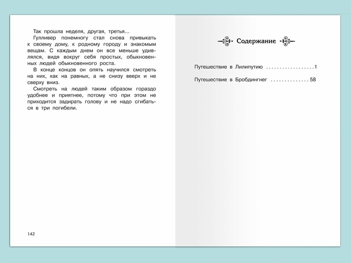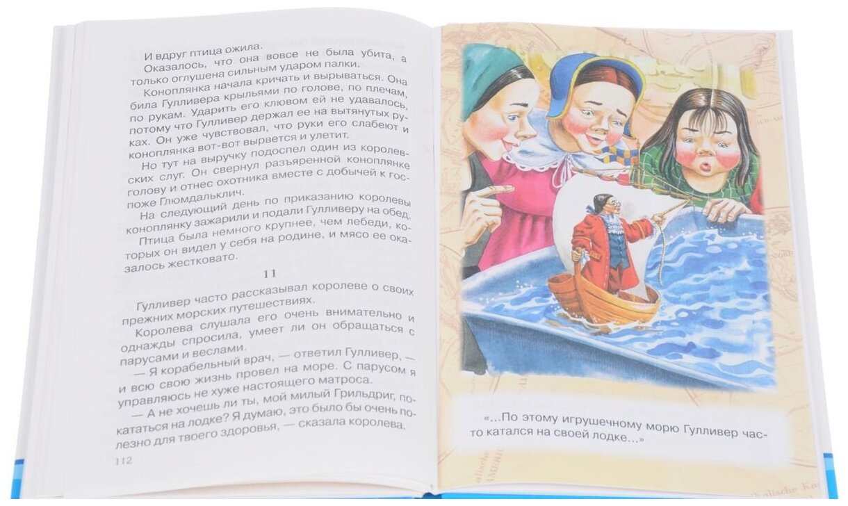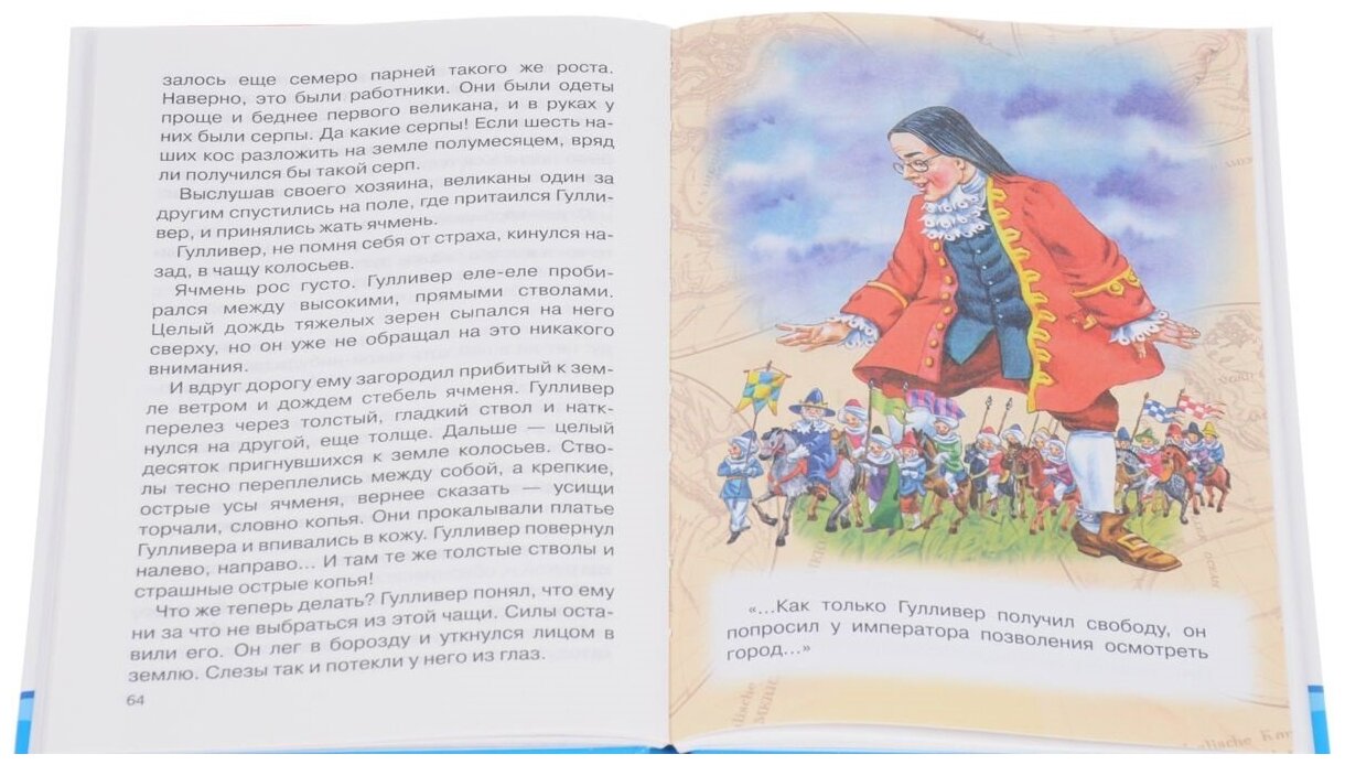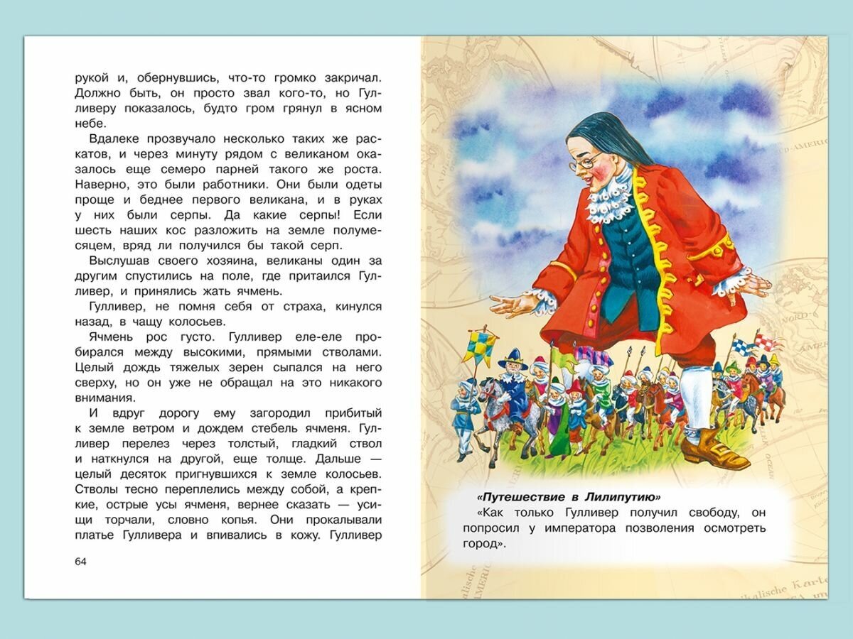 Сатирический роман «Путешествия Лемюэля Гулливера», принадлежащий перу классика английской литературы Джонатана Свифта, - одно из величайших произведений мировой литературы. Благодаря увлекательным приключениям главного героя и занимательному сюжету «Путешествия Гулливера» давно стали любимой книгой и детей и взрослых.В сборнике, выпущенном издательством «Омега» в серии «Школьная библиотека», представлены первые две части романа в детском пересказе Тамары Габбе – «Путешествие в Лилипутию» и «Путешествие в Бробдингнег».Представленные в сборнике произведения включены в школьную программу по внеклассному чтению и адресованы ребятам среднего школьного возраста.Текст пересказа представлен без сокращений, напечатан на хорошей бумаге крупным шрифтом и содержит цветные иллюстрации И. Бодровой. Средний формат и небольшой вес издания делают его удобным для домашней или школьной библиотеки и необременительным грузом в рюкзаке школьника.