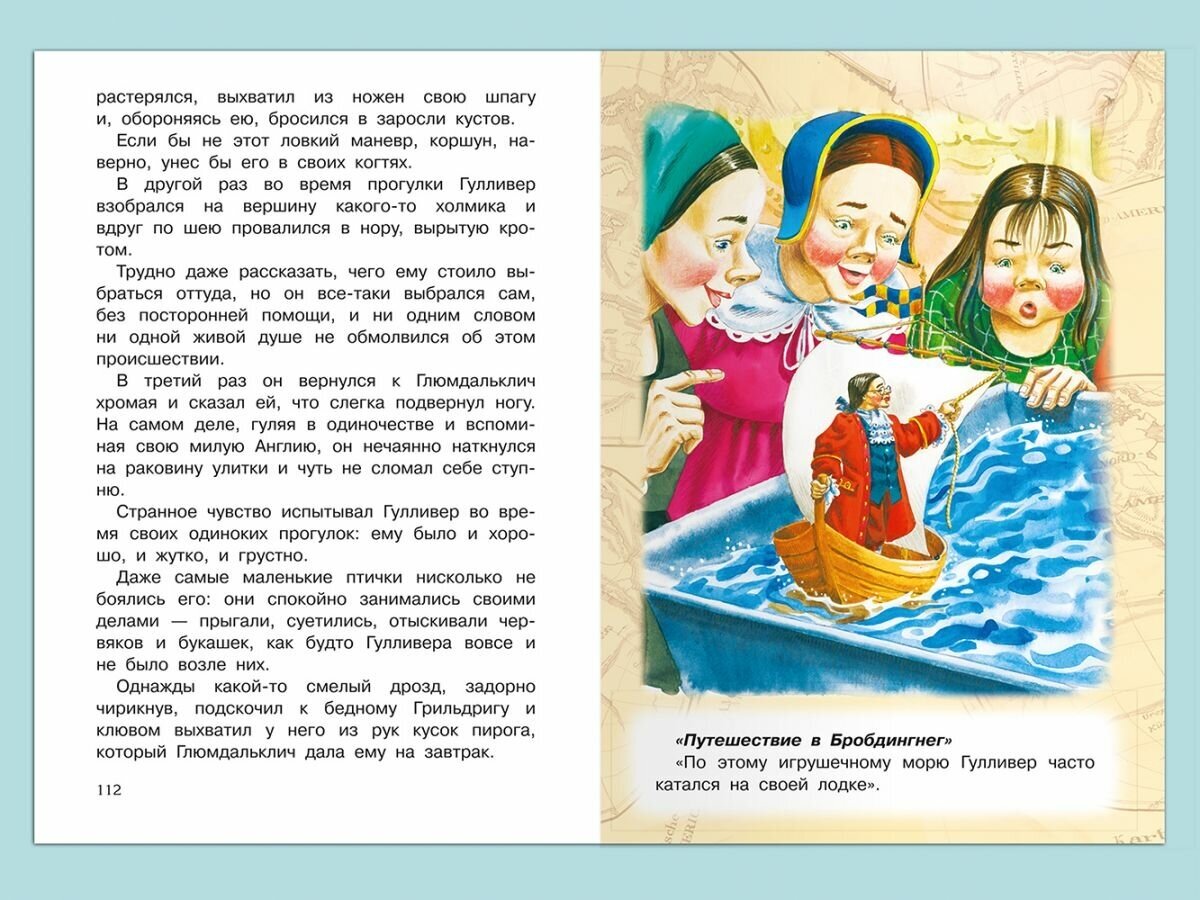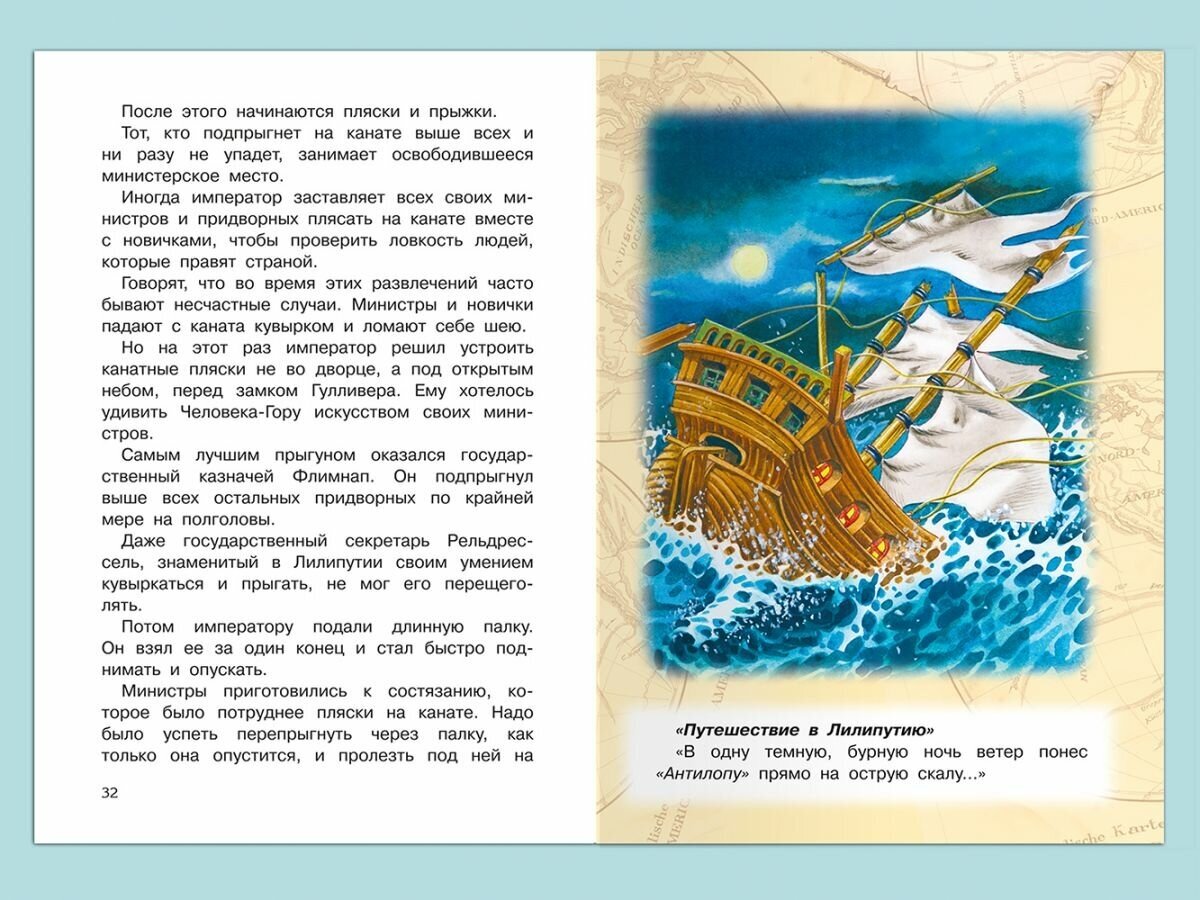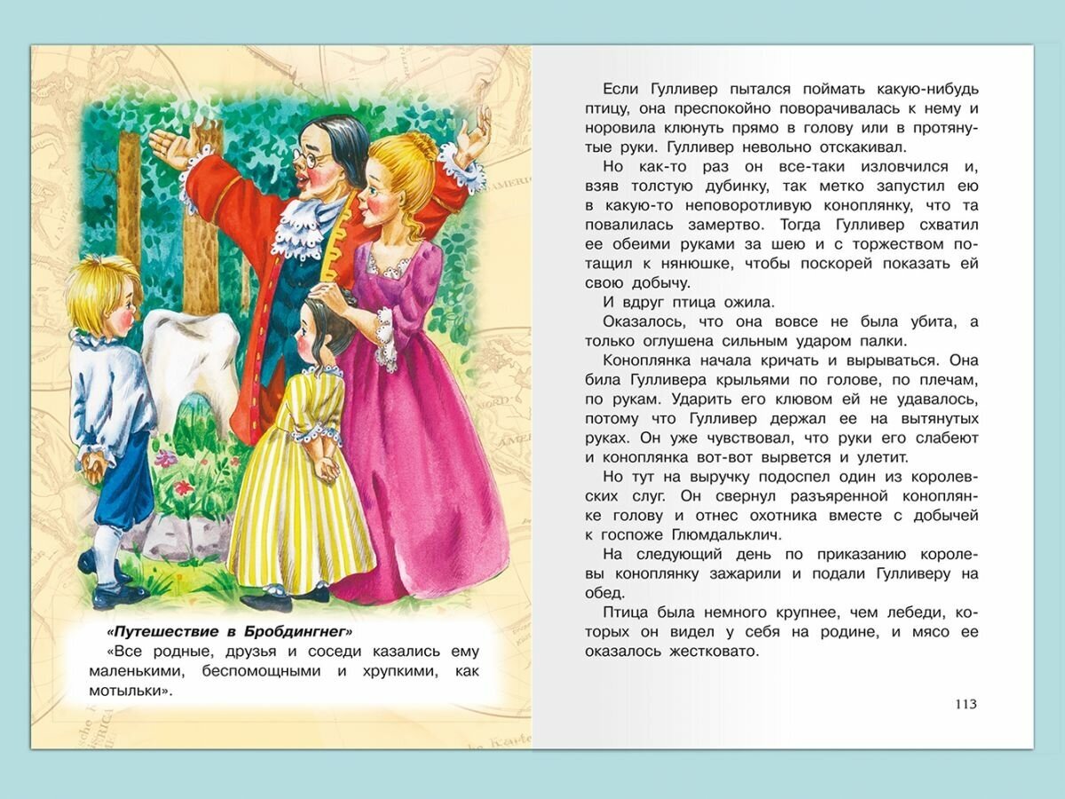 Сатирический роман «Путешествия Лемюэля Гулливера», принадлежащий перу классика английской литературы Джонатана Свифта, - одно из величайших произведений мировой литературы. Благодаря увлекательным приключениям главного героя и занимательному сюжету «Путешествия Гулливера» давно стали любимой книгой и детей и взрослых.В сборнике, выпущенном издательством «Омега» в серии «Школьная библиотека», представлены первые две части романа в детском пересказе Тамары Габбе – «Путешествие в Лилипутию» и «Путешествие в Бробдингнег».Представленные в сборнике произведения включены в школьную программу по внеклассному чтению и адресованы ребятам среднего школьного возраста.Текст пересказа представлен без сокращений, напечатан на хорошей бумаге крупным шрифтом и содержит цветные иллюстрации И. Бодровой. Средний формат и небольшой вес издания делают его удобным для домашней или школьной библиотеки и необременительным грузом в рюкзаке школьника.