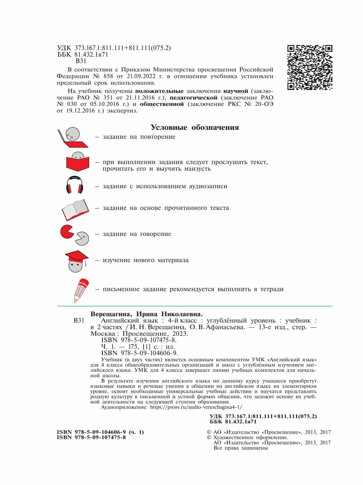 Учебник (в двух частях) является основным компонентом УМК "Английский язык" для 4 класса общеобразовательных организаций и школ с углублённым изучением английского языка. УМК для 4 класса завершает линию учебных комплектов для начальной школы .В результате изучения английского языка по данному курсу учащиеся приобретут языковые навыки и речевые умения в общении на английском языке на элементарном уровне, освоят необходимые универсальные учебные действия и научатся представлять родную культуру в письменной и устной формах общения, что заложит основу их учебной деятельности на следующей ступени образования.Допущено Министерством просвещения Российской Федерации.