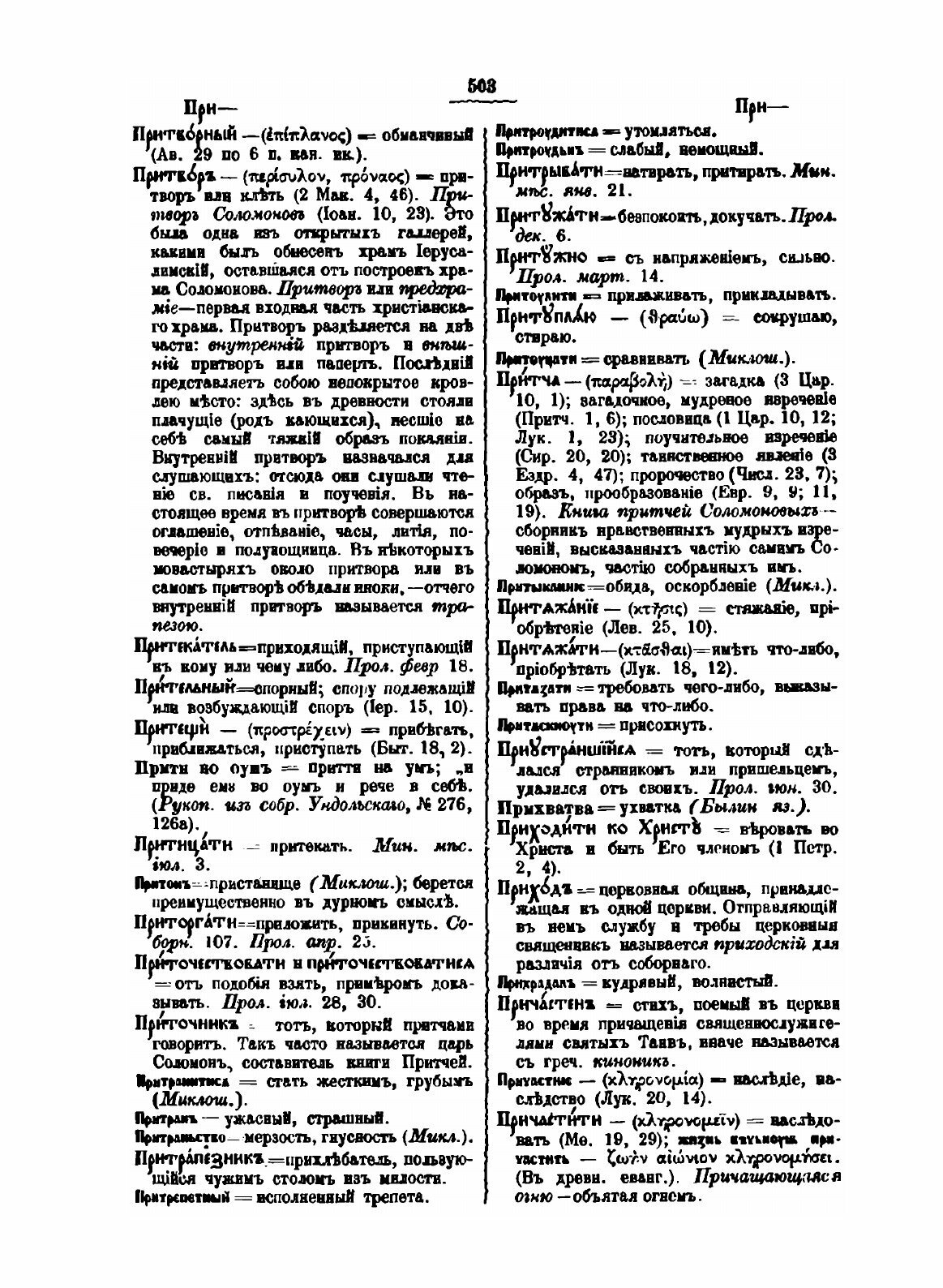 Словарь содержит объяснения малопонятных слов и оборотов, встречающихся в церковно-славянских и древнерусских рукописях и книгах, а именно:• священно-библейских книгах Ветхого и Нового Заветов;• церковно-богослужебных (Октоихе, Триодях, Минеях, Часослове, Псалтири, молитвослове, Требнике и проч.);• духовно-поучительных, например, в Прологе, Патерике, Четьих-Минеях, творениях святых отцов и прочих;• церковно-канонических книгах древней духовной как переводной, так и самобытной письменности, а также в памятниках светской древнерусской как переводной, так и самобытной письменности, как то: в летописях, изборниках, судных грамотах, уложениях, договорах, былинах, песнях, пословицах и других поэтических произведениях древнерусской письменности, начиная с X до XVIII вв. включительно.В ограниченном объеме словарь может быть использован для изучающих церковнославянский язык (при этом этимологическую часть словарных статей, в особенности, попытки сравнительно-исторического анализа с привлечением индоевропейского языкового материала следует пропускать), для священнослужителей, катехизаторов, для всех интересующихся русской церковной историей и церковной культурой. Для филологов и специалистов, изучающих становление и развитие науки о языке в России. Издание представляет определенный (ограниченный) интерес для готовящихся к поступлению в духовные школы, для воспитанников духовных учебных заведений, студентов богословских вузов и факультетов (учебный предмет «Церковнославянский язык»).