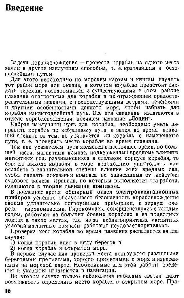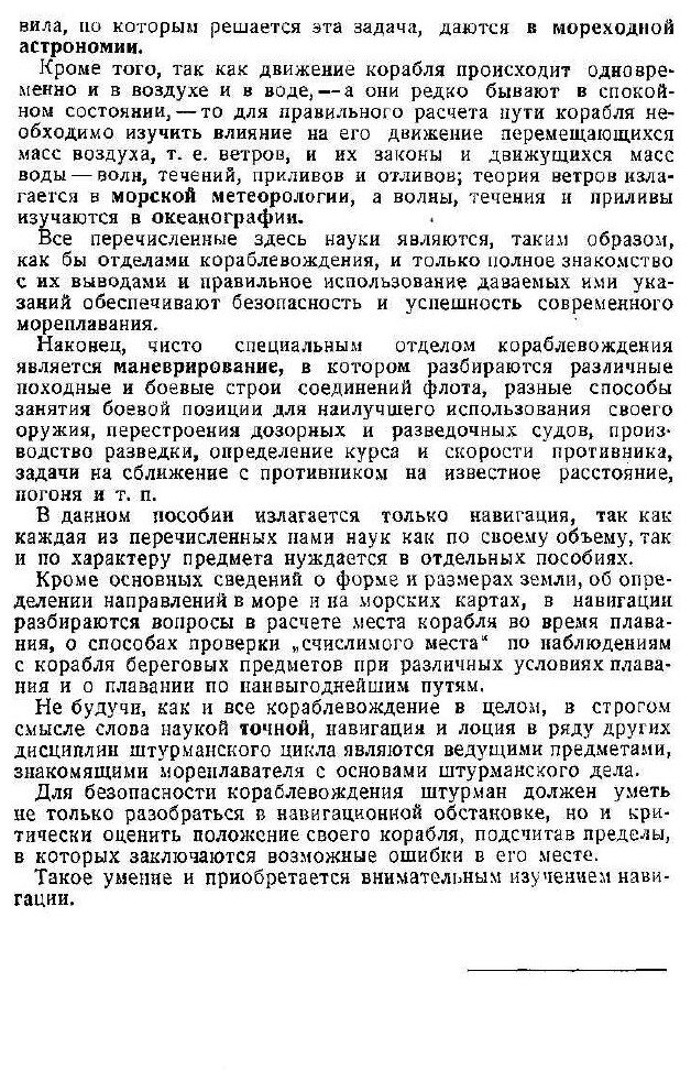 Книга является одним из наиболее полных пособий по морской навигации и содержит обстоятельное и ясное изложение как теоретических вопросов кораблевождении, так и указания по практическому разрешению их на мостике корабля. Изложение сопровождается многочисленными примерами и упражнениями, дающими обширный материал для повторения и закрепления пройденного в памяти изучающих предмет. Книга предназначена в качестве учебника для Военно-морского училища им. М. В. Фрунзе и Специальных курсов командного состава МС РККА им. ЦИК Татарской ССР, по программам которых она и составлена. Настоящее издание является посмертным, но переработано и дополнено в рукописи автором