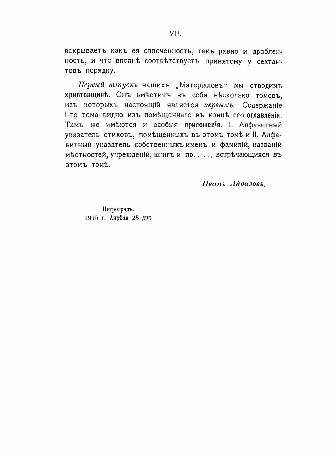 В предисловии к изданию Айвазов говорит что, исследование русских мистических сект является достаточно трудным делом, т. к. сектанты стараются тщательно скрывать свое религиозное мировоззрение и быт под видом строго православия или раскольнических толков. По мнению автора, опубликование материалов для исследования русских мистических сект "Является делом первейшей важности: как для научного изучения этих сект, так и для определения отношения к ним церкви и государства". В "Материалах приводятся подлинные свидетельства самих сектантов. Первый том посвящен христовщине, второй - раскрывает жизнь современной автору христовщины. Центральной личностью второго тома является Увар (Уар) Федорович Ермоленко. В издании имеются алфавитные указатели стихов, собственных имен и фамилий, названий местностей, книг и т. д. Воспроизведено в оригинальной авторской орфографии издания 1915 года (издательство "Петроградъ: Тип. П.Я. Синченко").