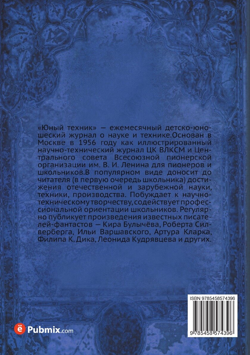 «Юный техник» — ежемесячный детско-юношеский журнал о науке и технике.Основан в Москве в 1956 году как иллюстрированный научно-технический журнал ЦК ВЛКСМ и Центрального совета Всесоюзной пионерской организации им. В. И. Ленина для пионеров и школьников.В популярном виде доносит до читателя (в первую очередь школьника) достижения отечественной и зарубежной науки, техники, производства. Побуждает к научно-техническому творчеству, содействует профессиональной ориентации школьников. Регулярно публикует произведения известных писателей-фантастов — Кира Булычёва, Роберта Силверберга, Ильи Варшавского, Артура Кларка, Филипа К. Дика, Леонида Кудрявцева и других.