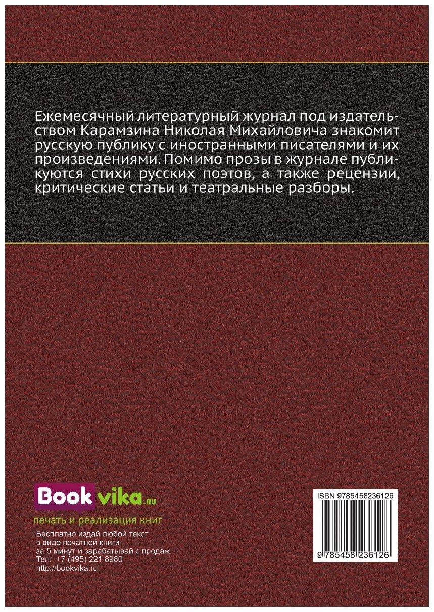Ежемесячный литературный журнал под издательством Карамзина Николая Михайловича знакомит русскую публику с иностранными писателями и их произведениями. Помимо прозы в журнале публикуются стихи русских поэтов, а также рецензии, критические статьи и театральные разборы.