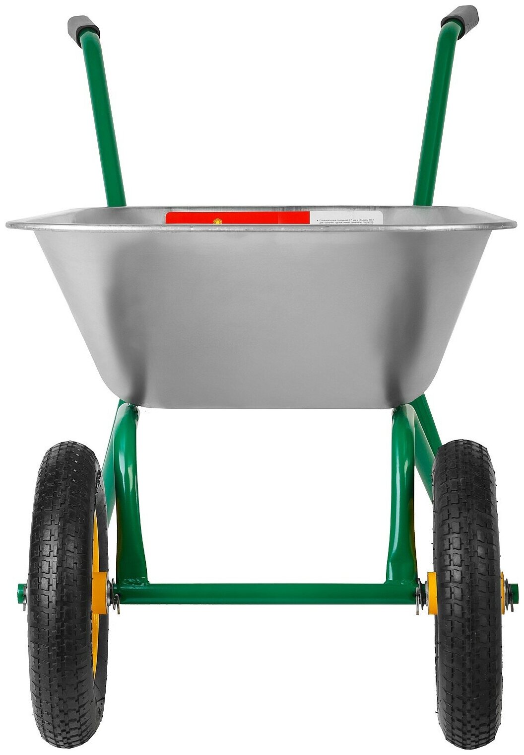 Стальной оцинкованный кузов обеспечит защиту тачки от внешних воздействий., Стальная рама из цельногнутой трубы диаметром 28 мм поддерживает кузов снизу и выдерживает нагрузку до 100 кг., Резиновое пневматическое колесо диаметром 360 мм, со стальным ободом и на стальных подшипниках, придает тачке дополнительную устойчивость обеспечивают легкое передвижение по неровной поверхности.
