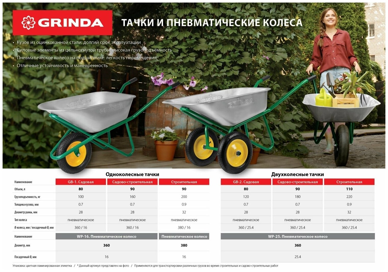 | Прочие особенности и свойства | Стальной оцинкованный кузов обеспечит защиту тачки от внешних воздействий. Стальная рама из цельногнутой трубы диаметром 28 мм поддерживает кузов снизу и выдерживает нагрузку до 100 кг. Резиновое пневматическое колесо диаметром 360 мм, со стальным ободом и на стальных подшипниках, придает тачке дополнительную устойчивость обеспечивают легкое передвижение по неровной поверхности. |