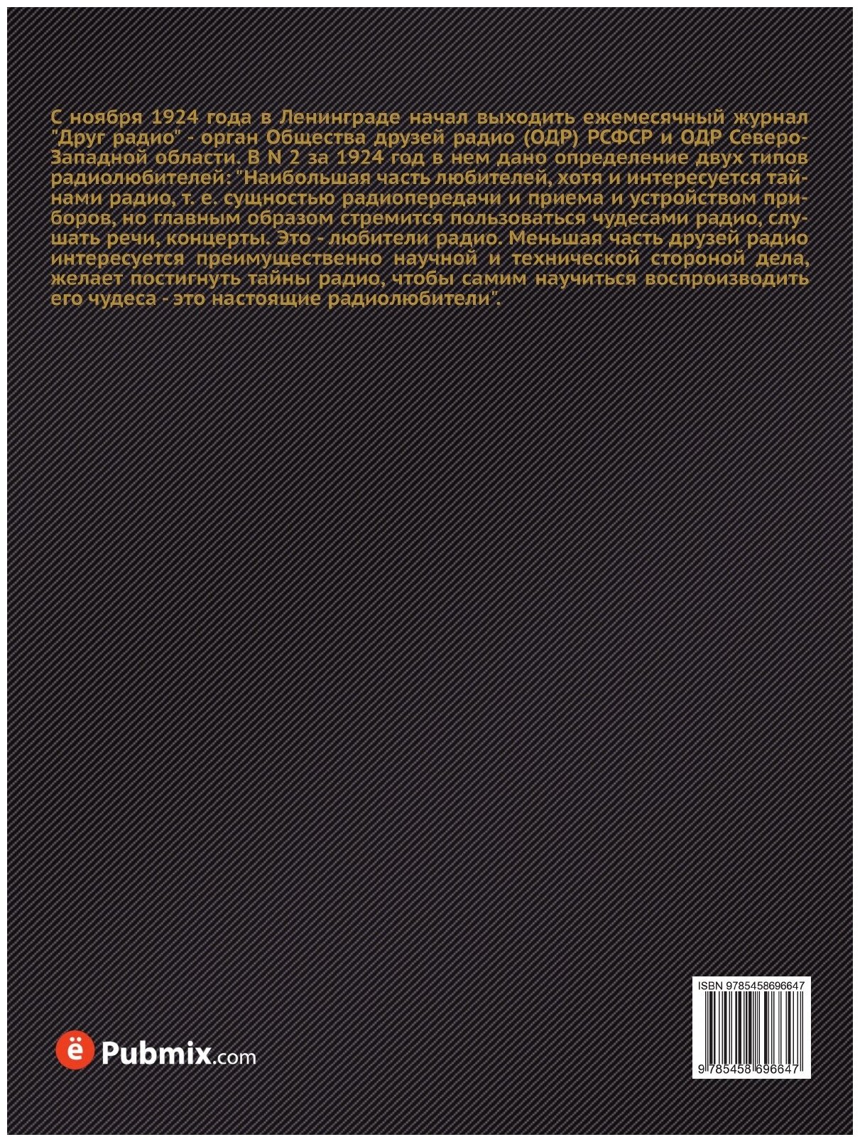 Эта книга — репринт оригинального издания (издательство "Ленинград: Издательство журнала "Радио"", 1926 год), созданный на основе электронной копии высокого разрешения, которую очистили и обработали вручную, сохранив структуру и орфографию оригинального издания. Редкие, забытые и малоизвестные книги, изданные с петровских времен до наших дней, вновь доступны в виде печатных книг.