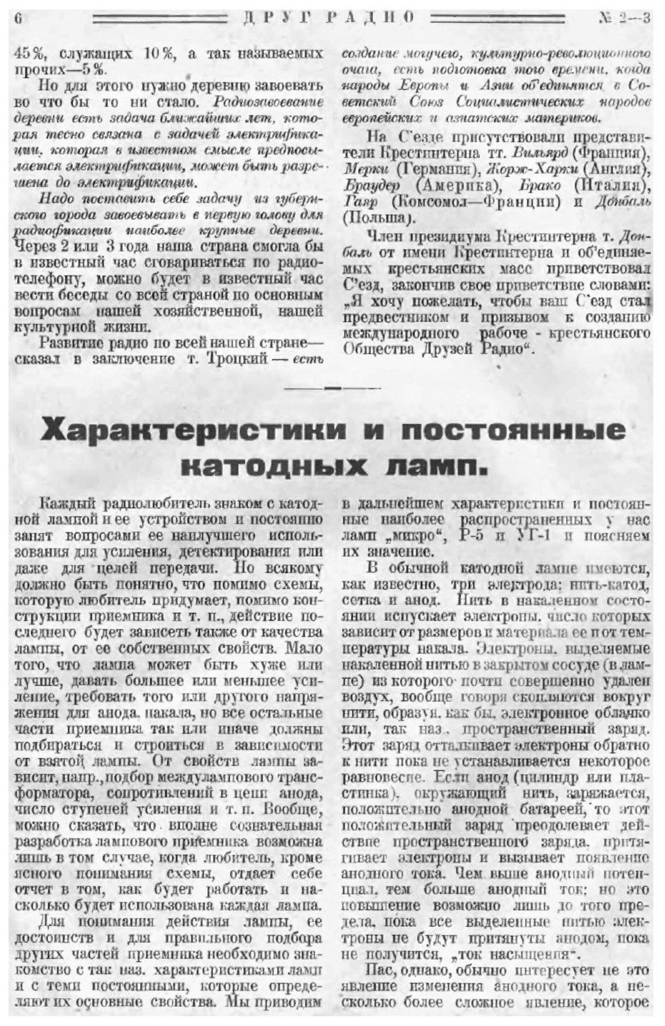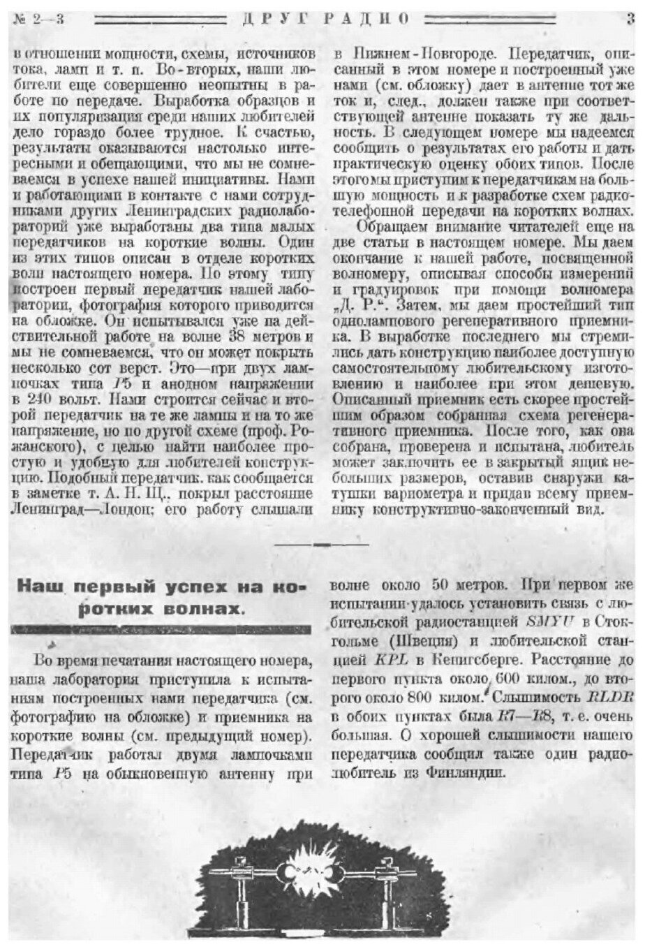 С ноября 1924 года в Ленинграде начал выходить ежемесячный журнал "Друг радио" - орган Общества друзей радио (ОДР) РСФСР и ОДР Северо-Западной области. В N 2 за 1924 год в нем дано определение двух типов радиолюбителей: "Наибольшая часть любителей, хотя и интересуется тайнами радио, т. е. сущностью радиопередачи и приема и устройством приборов, но главным образом стремится пользоваться чудесами радио, слушать речи, концерты. Это - любители радио. Меньшая часть друзей радио интересуется преимущественно научной и технической стороной дела, желает постигнуть тайны радио, чтобы самим научиться воспроизводить его чудеса - это настоящие радиолюбители".