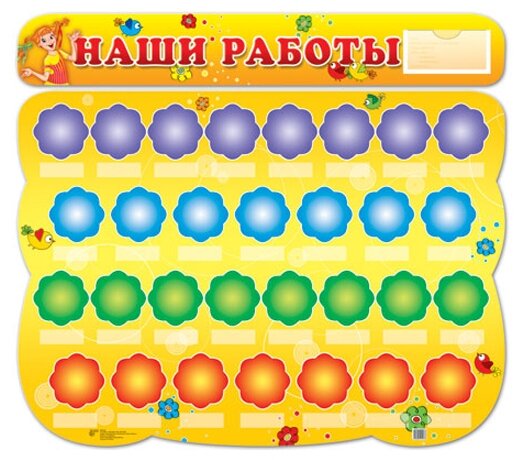 Стенд предназначен для размещения детских работ из пластилина, глины, природного или бросового материалов и т.д. Стенд сделан из качественного плотного картона с яркими иллюстрациями, в индивидуальной упаковке. Рассчитан на 30 детских работ. Его можно размещать как в раздевалке, так и в групповой комнате. В комплект входят: 1) стенд для детских работ размером 670 x 486 мм, 2) красочная вывеска «Наши работы» размером 670 x100 мм, 3) пластиковые прямоугольники размером 65 x 60 мм для полочек под размещение детских работ. 4) двусторонний скотч для крепления полочек. Яркое оформление стенда привлечет внимание не только детей, но и родителей. А информация, размещенная в специальном кармашке, поможет узнать когда, чем именно занимались дети, что лепили или мастерили, какой педагог проводил с ними работу, какую задачу ставил педагог перед детьми и какие именно навыки развивались на этом занятии.