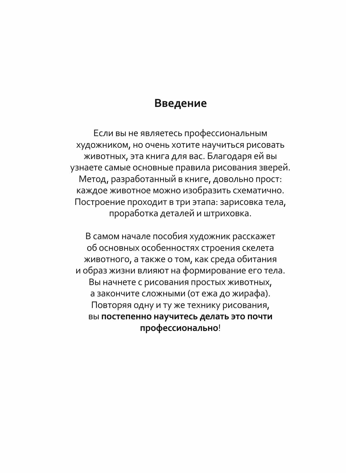 Если вы не являетесь профессиональным художником, но очень хотите научиться рисовать животных, эта книга для вас. Благодаря ней вы усвоите основные правила рисования зверей. Метод, разработанный в книге, довольно прост: каждое животное можно изобразить схематично. Построение проходит в три этапа: зарисовка тела животного, проработка деталей и штриховка. В самом начале этого пособия художник расскажет об основных особенностях строения скелета животного, а также о том, как среда обитания и образ жизни влияют на формирование его тела. Рисовать животных - это не так уж сложно!