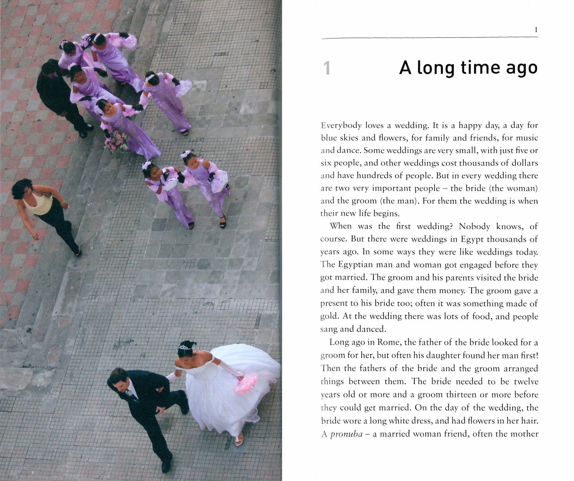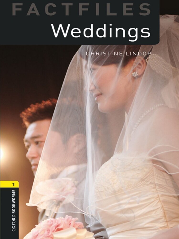 STAGE 1 - Factfiles'The bride wore a long white dress, with flowers in her hair. After the wedding, there was a party, and people gave presents to the bride and groom.' This wedding was nearly two thousand years ago, in Rome. Some things don't change.But some things do. Today you can have a wedding on a mountain, or under the sea, or 'Elvis' can sing for you. And different things happen in different places. Little birds made of paper, small trees, money in the bride's shoe, and lots of noise - they are all important for weddings somewhere. Welcome to the wonderful world of weddings!